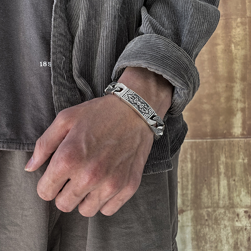 S925 sterling silver men's bracelet Six-character mantra Vajra domineering personality pop male vintage Thai silver to ward off evil spirits lucky silver jewelry