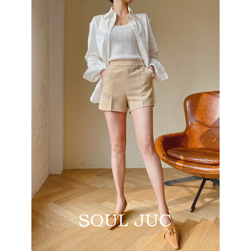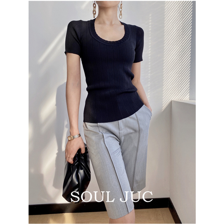 SOUL JUC U-shaped collar ice-knitted sweatshirt woman short sleeve white T-shirt short 100 hitch set head blouse Summer thin