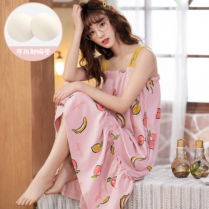With chest pad night dress female summer suspender small sexy cute student pajamas Cotton girl long version over-the-knee home clothes