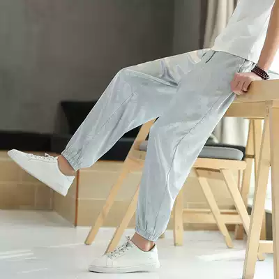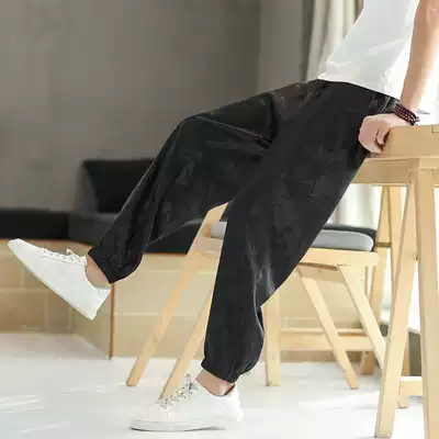 Chinese style casual men's pants summer thin cool ice silk wide-leg pants loose large size Harem pants drawstring pants all-match