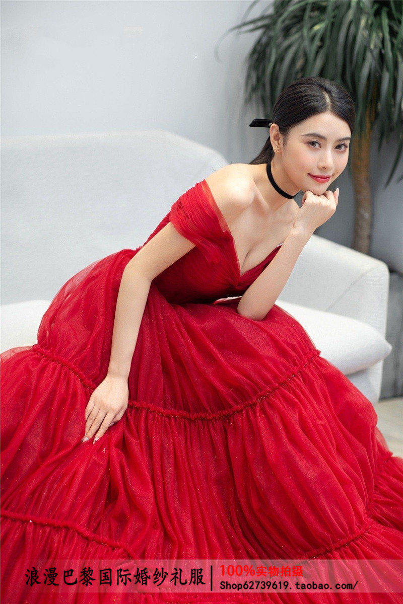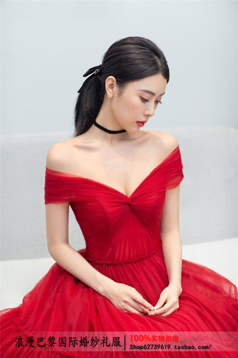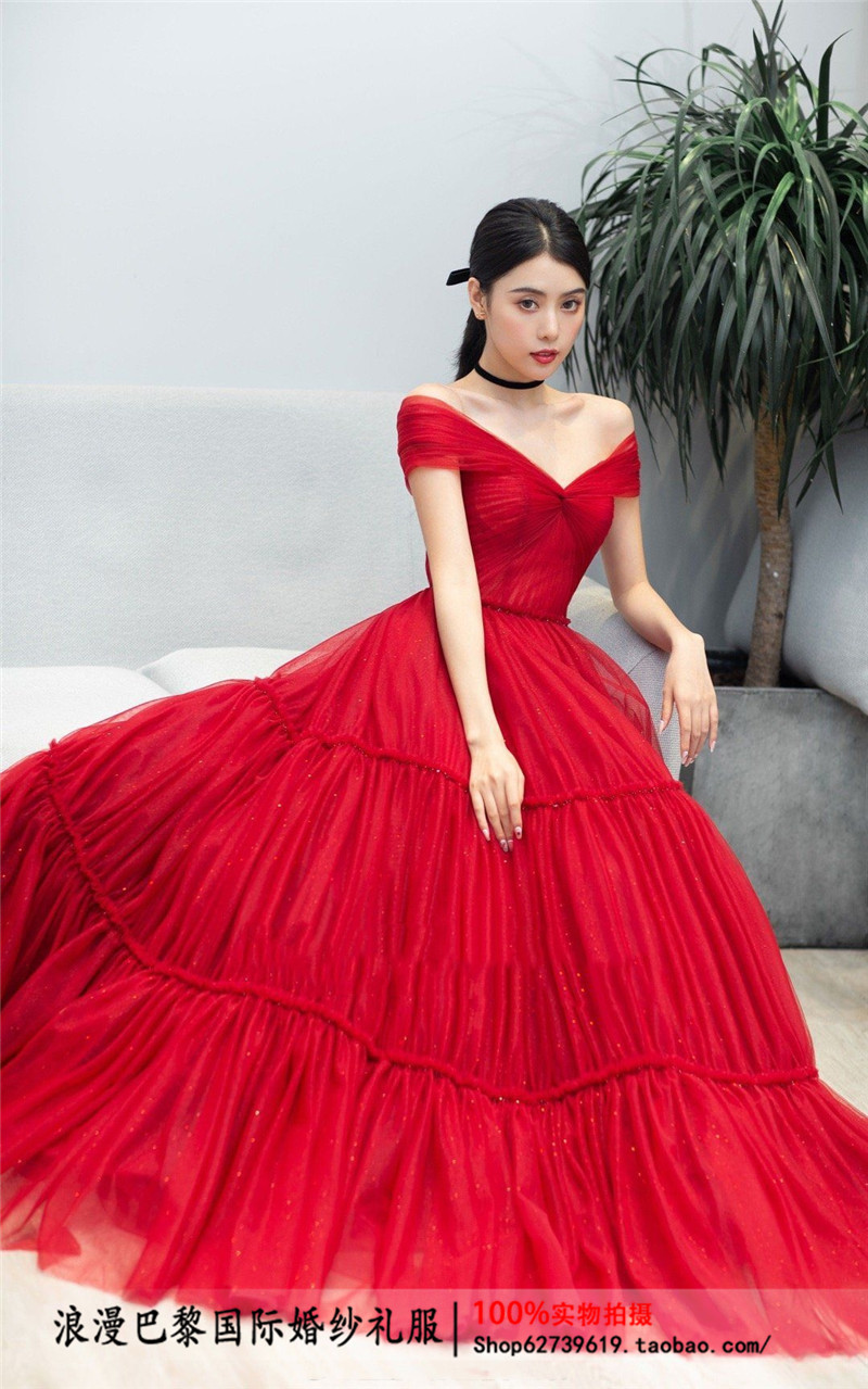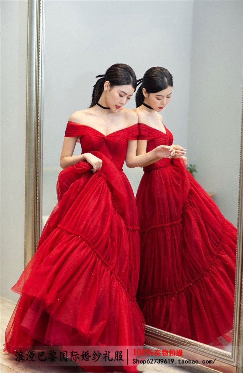 Shoulder red wedding dress bride wedding dinner toast taste fit menstruation dinner dress