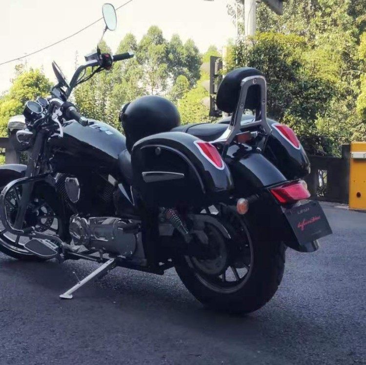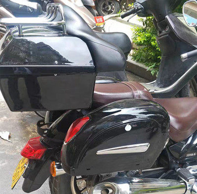 Blue saddlebags with side racks. Black saddlebags with side racks. White saddlebags with side racks. White three boxes with tail rack. Black three boxes with tail rack. Blue three boxes with tail rack (the tail box has color difference). Fast strap on the rear left side. After removing the side frame