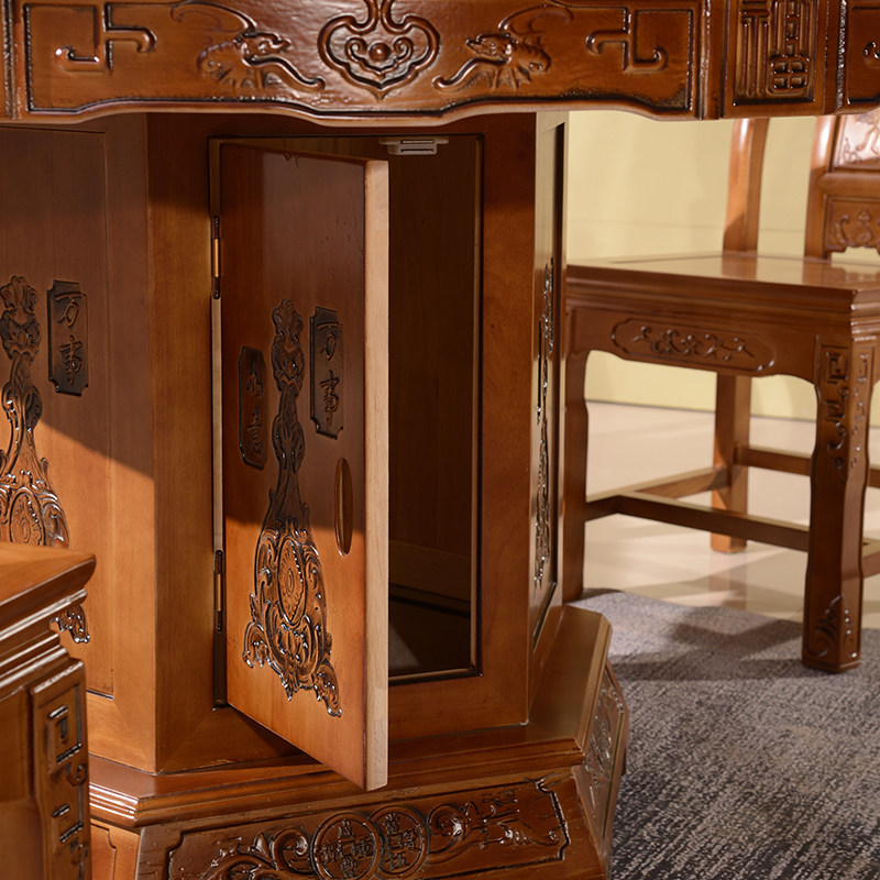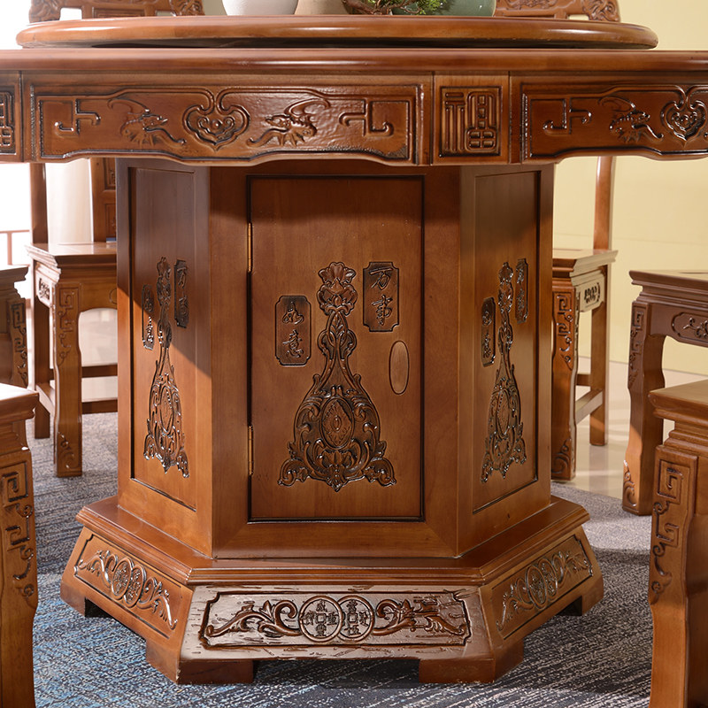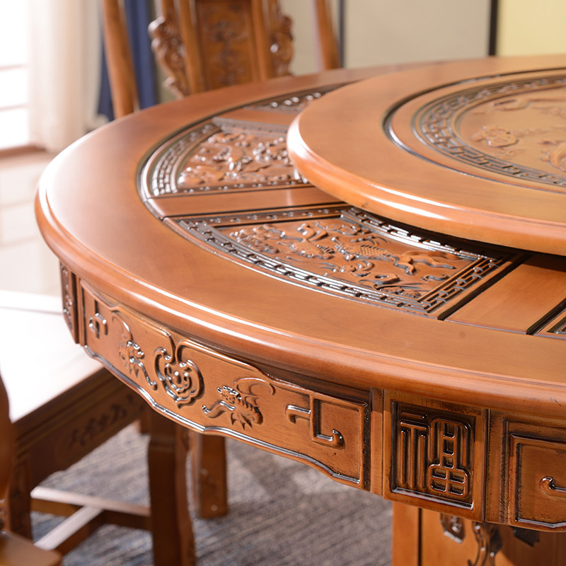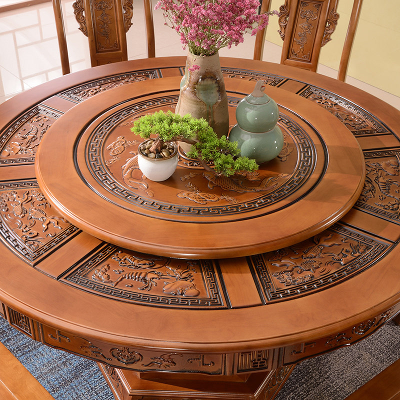 All - solid wood antique sculpture dining table and chair 10 people with tempered glass Chinese antique sculpture round table household