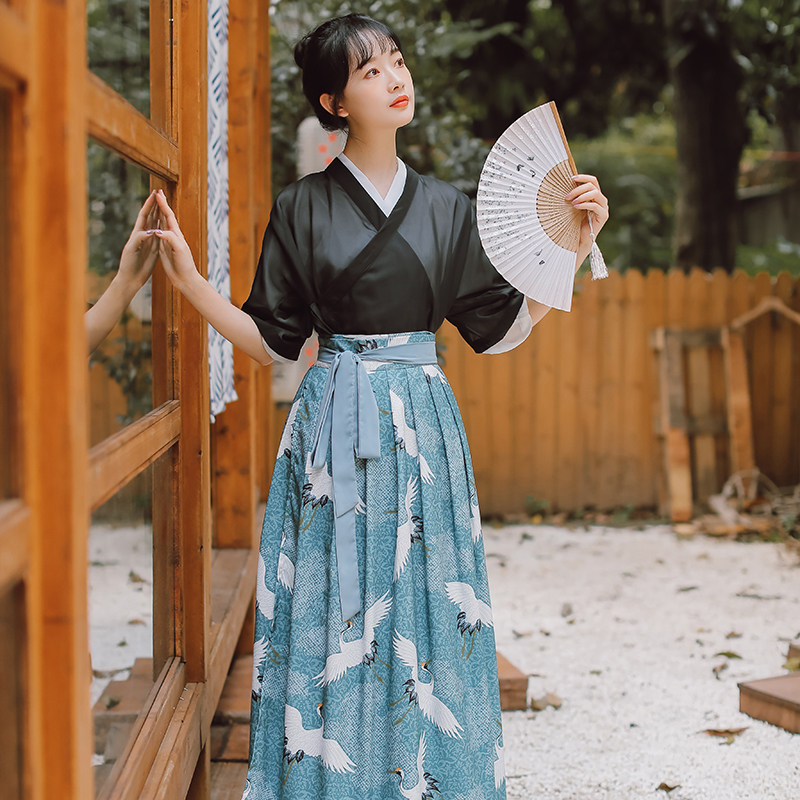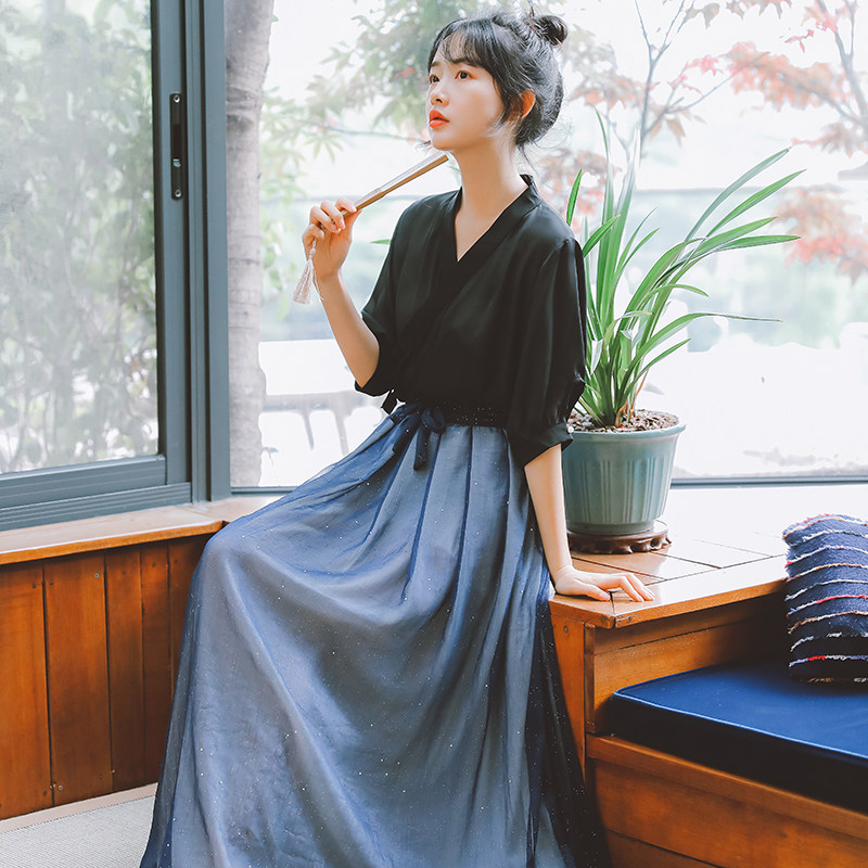 Ancient costume women's Hanfu suit Chinese style French retro improved foreign style chiffon shirt top skirt two-piece set female summer