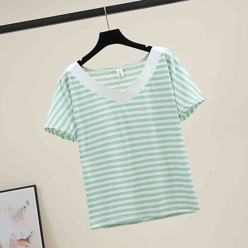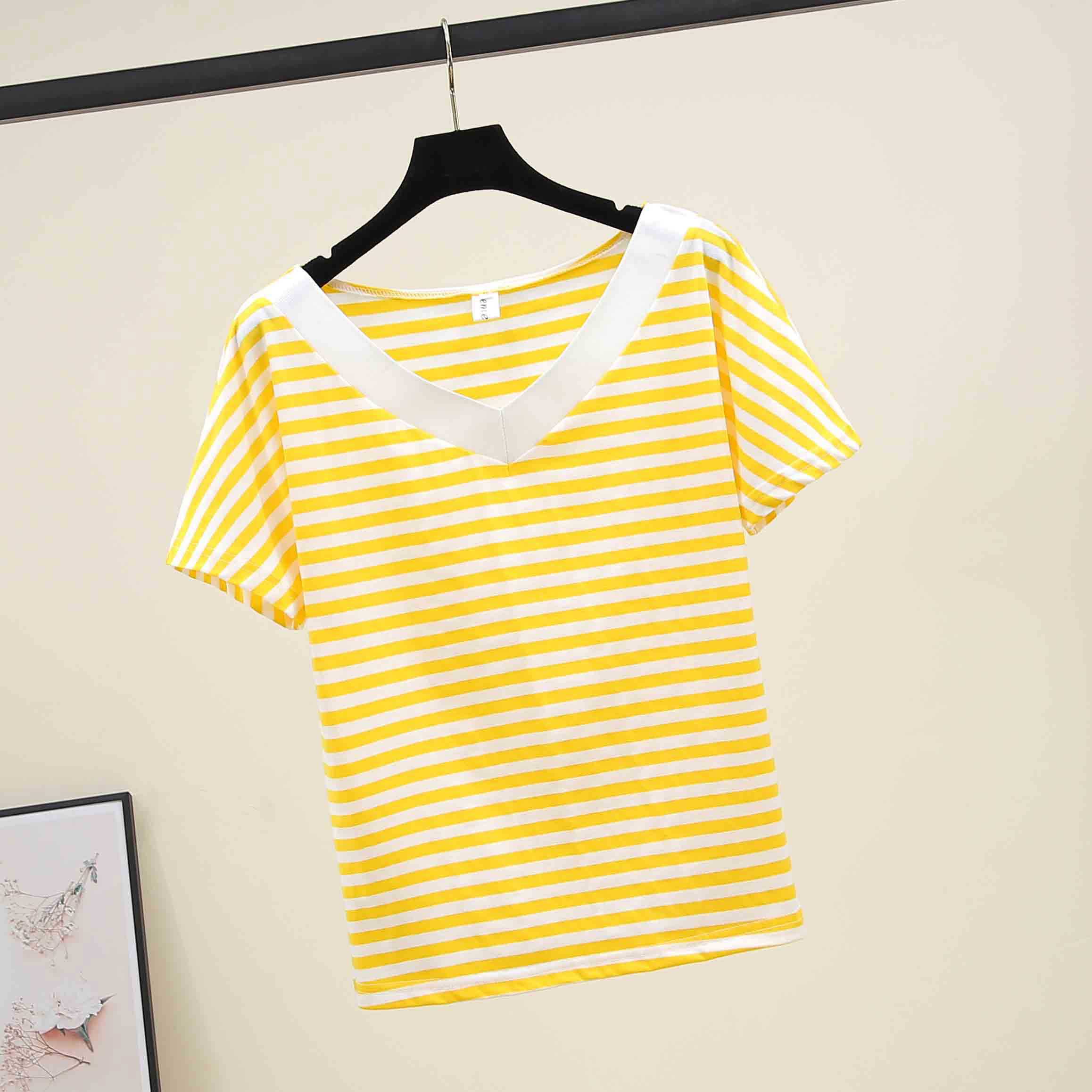 2022 new color-blocking half-sleeved T-shirt female V-neck yellow short-sleeved all-match striped student loose bat-sleeved top trendy