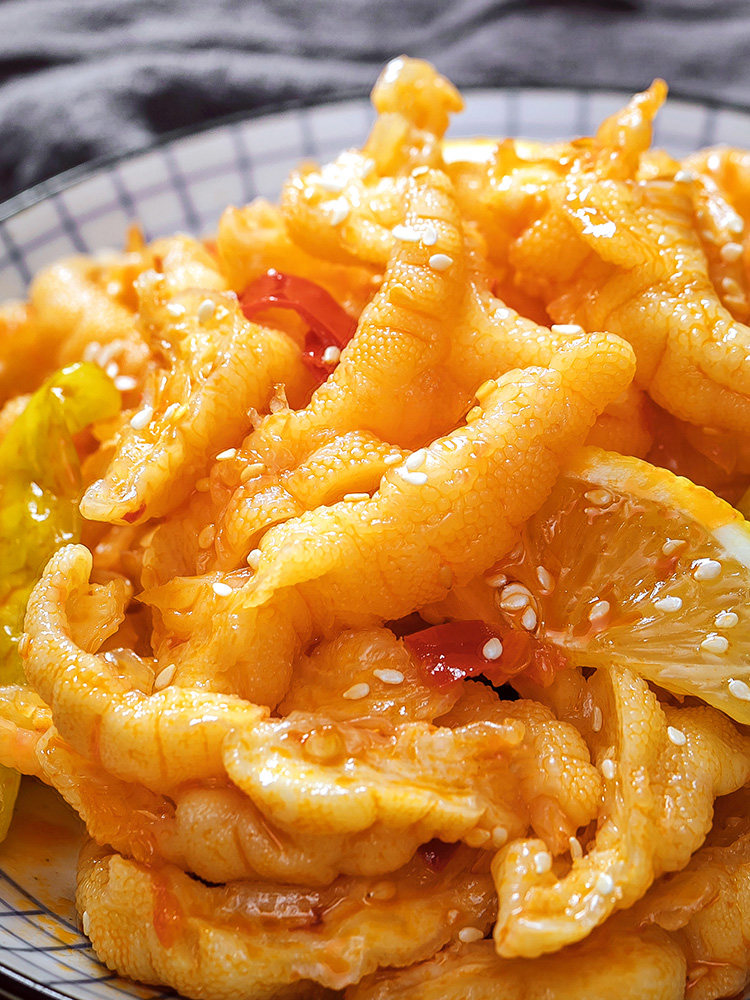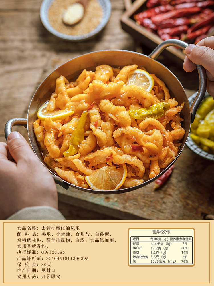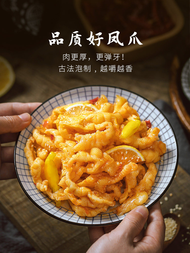 Sour and spicy lemon chicken feet 210g sour and spicy buy 2 get one fresh and spicy pickled pepper chicken feet 210g slightly spicy buy 2 get one spicy red oil chicken feet 210g plus spicy taste buy 2 get one sour and spicy lemon chicken feet 250g acid