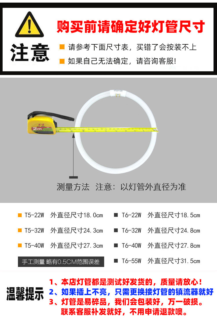 T5-22W (positive white light) Outer diameter 18 0cmT5-32W (positive white light) Outer diameter 24 3cmT5-32W (warm white light) Outer diameter 27 3cm