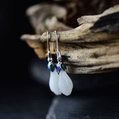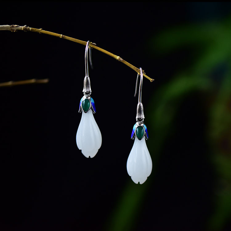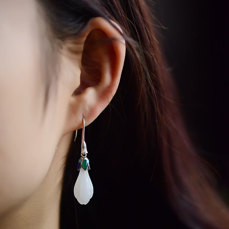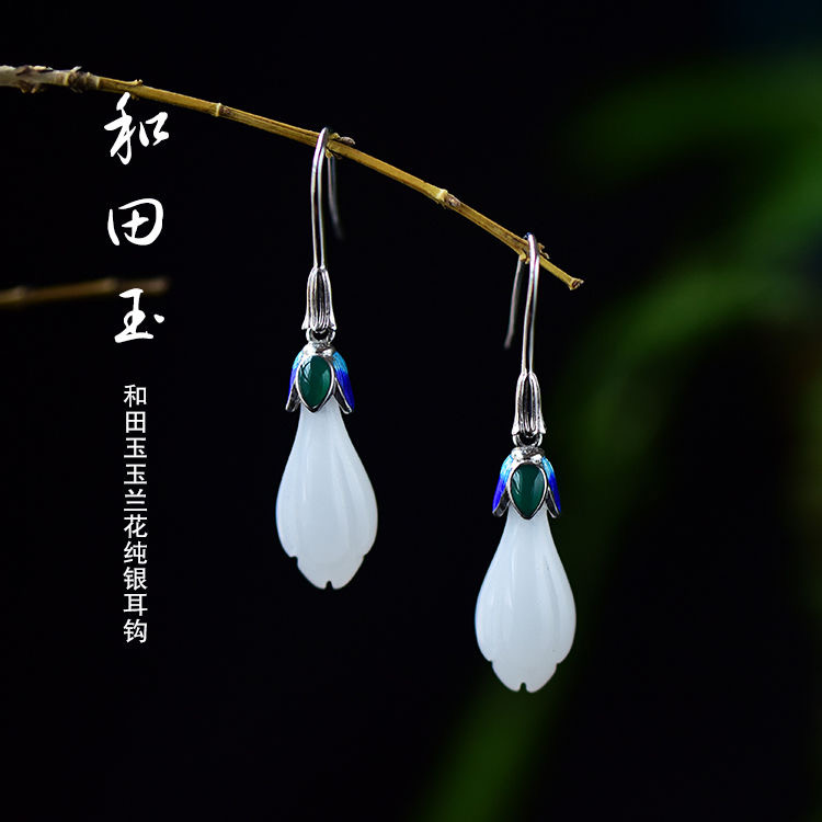 s925 sterling silver inlaid Hetian magnolia flower jade earrings retro earrings with cheongsam costume silver ear hook earrings