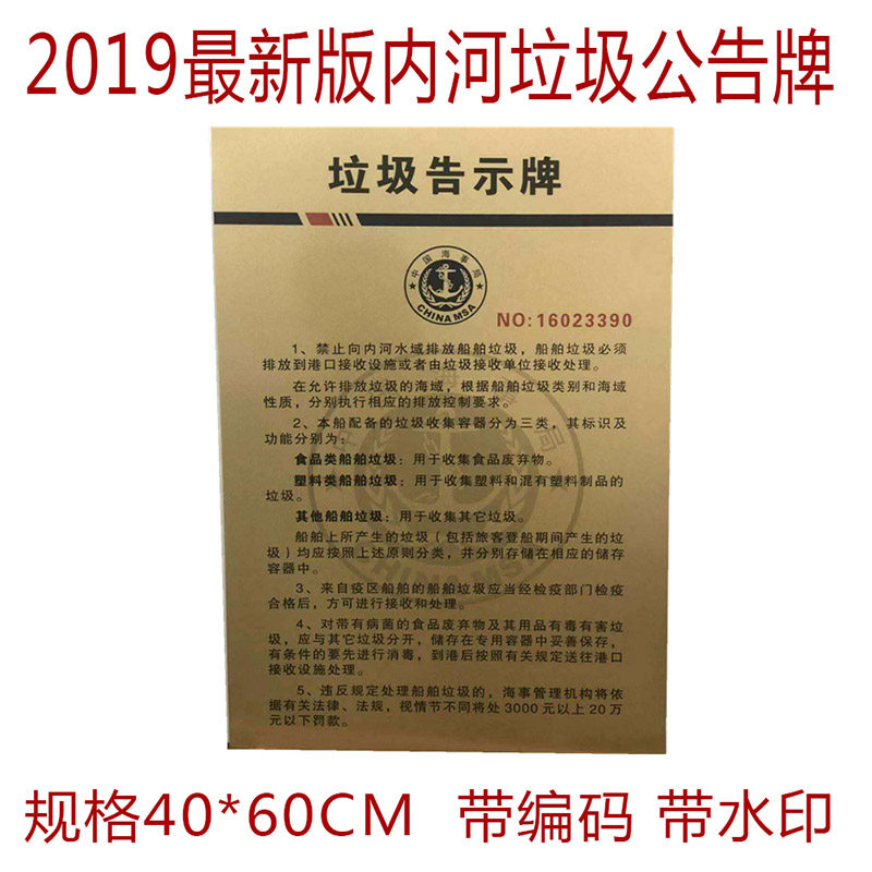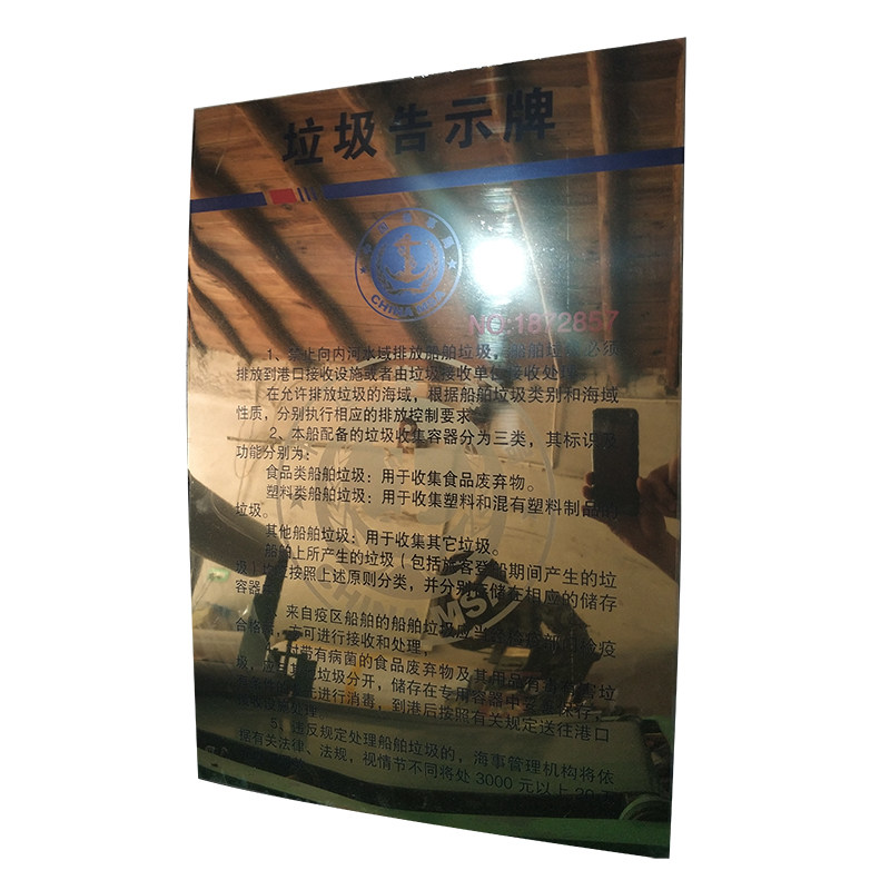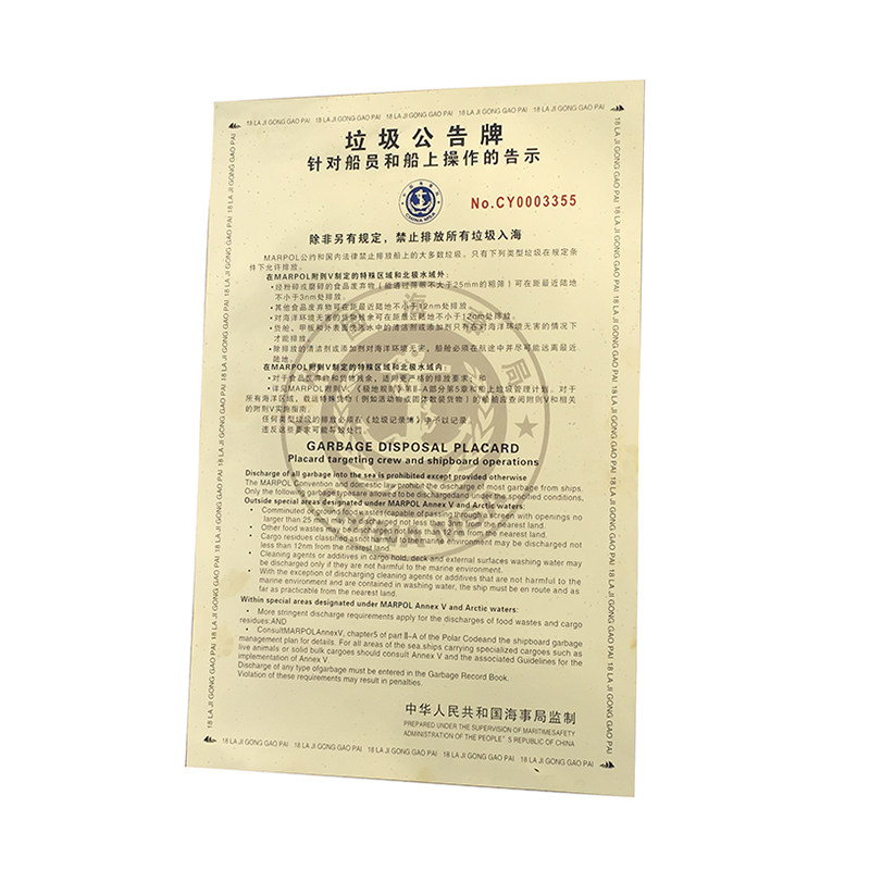 2020 edition of the Sea Bureau endorsed river version plastic Chinese version with watermark garbage bulletin board coastal ship with Chinese and English garbage notice Titanium Alloy Copper Face Warning Garbage Card