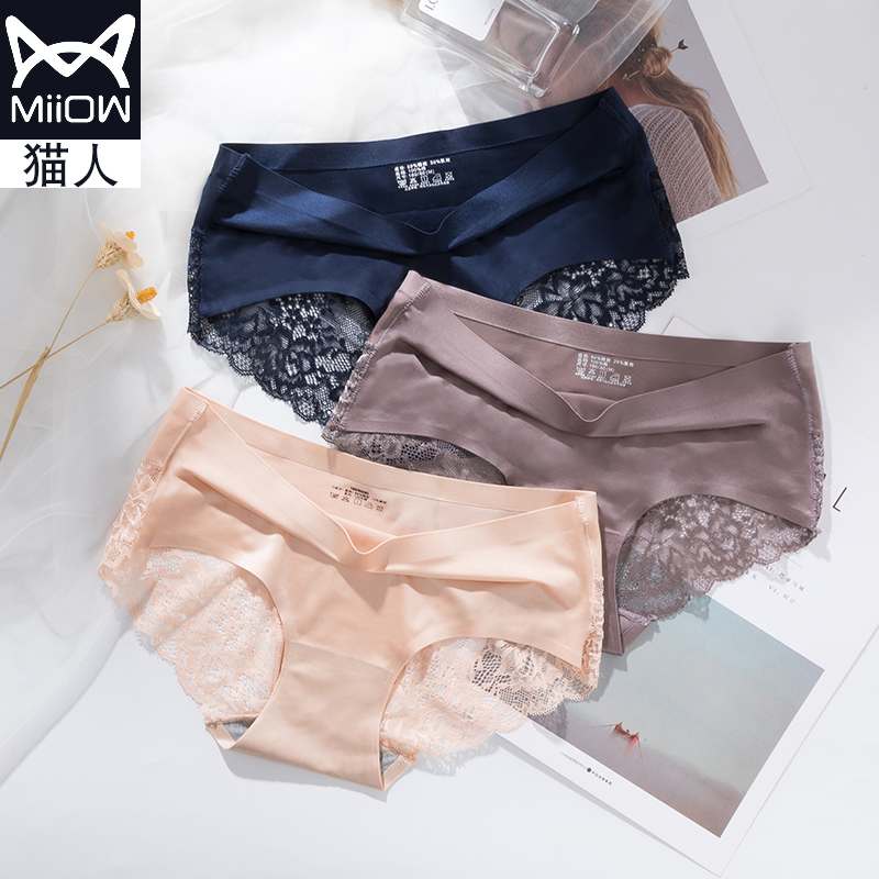 Cat lady's underwear Ice Silk Lace Pure Cotton Crotch antibacterial mid-waist No marks Summer thin Breathable Triangle Shorts