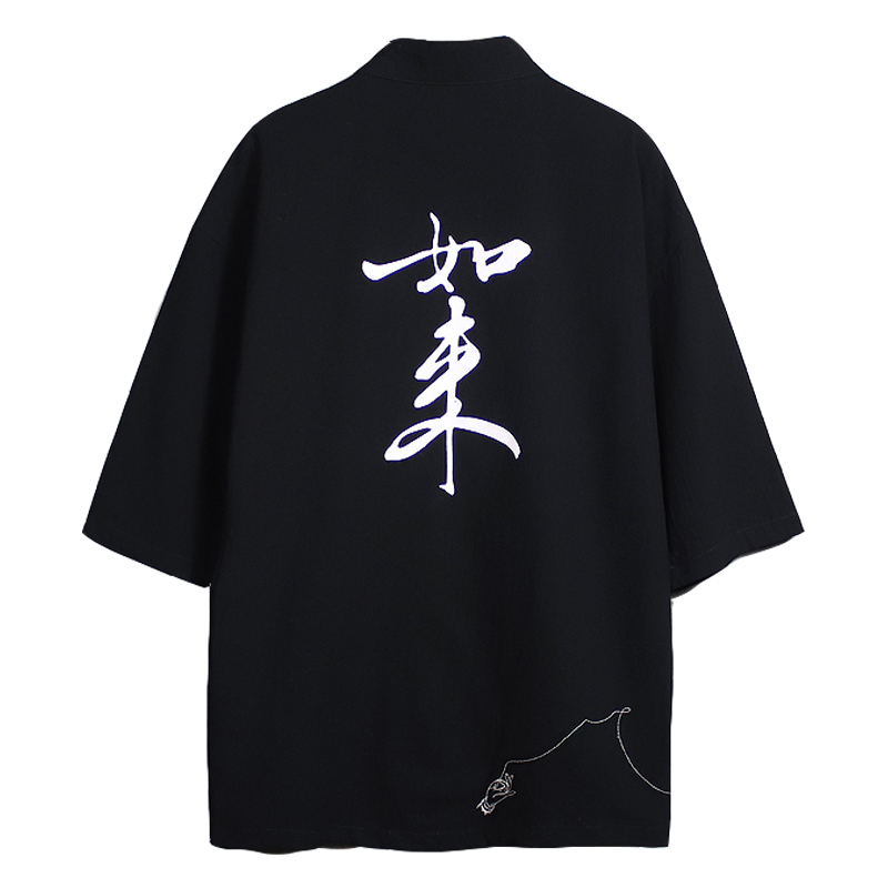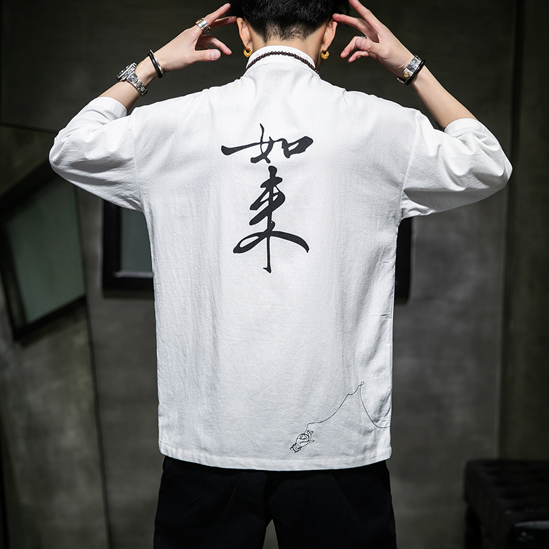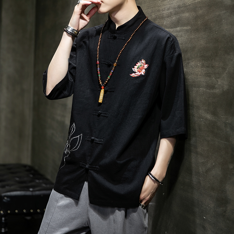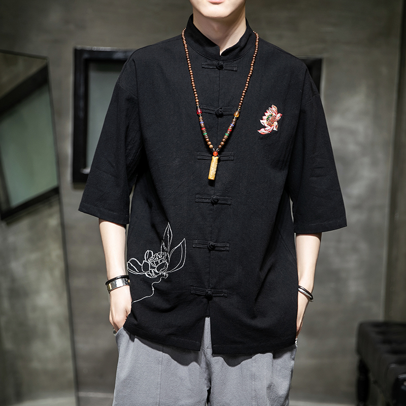 Chinese wind linen shirt male short sleeve T-shirt Summer embroidered upright collar large size shirt thin tea suit Residence Conserved Tide