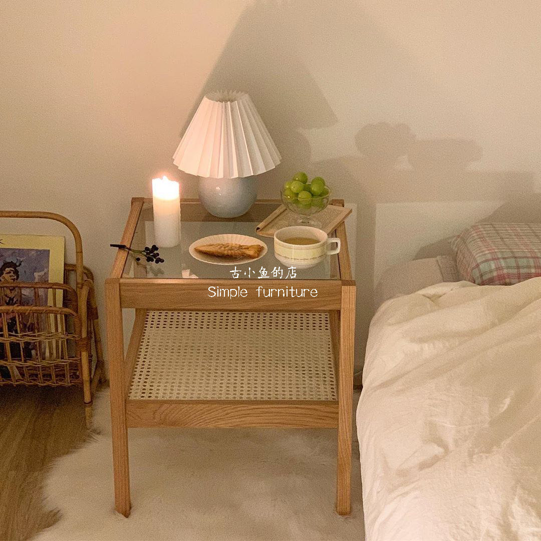 Gu Xiaoyu ins Solid wood edge a few simple rattan small coffee table square glass side cabinet Korean bed and breakfast bed cabinet