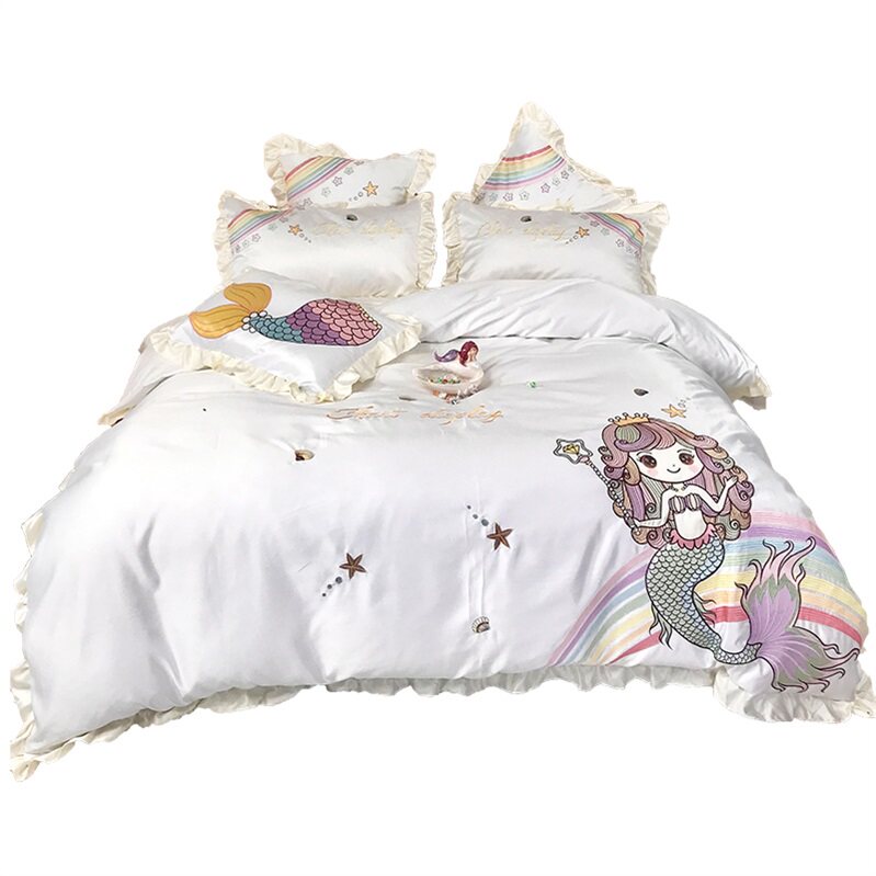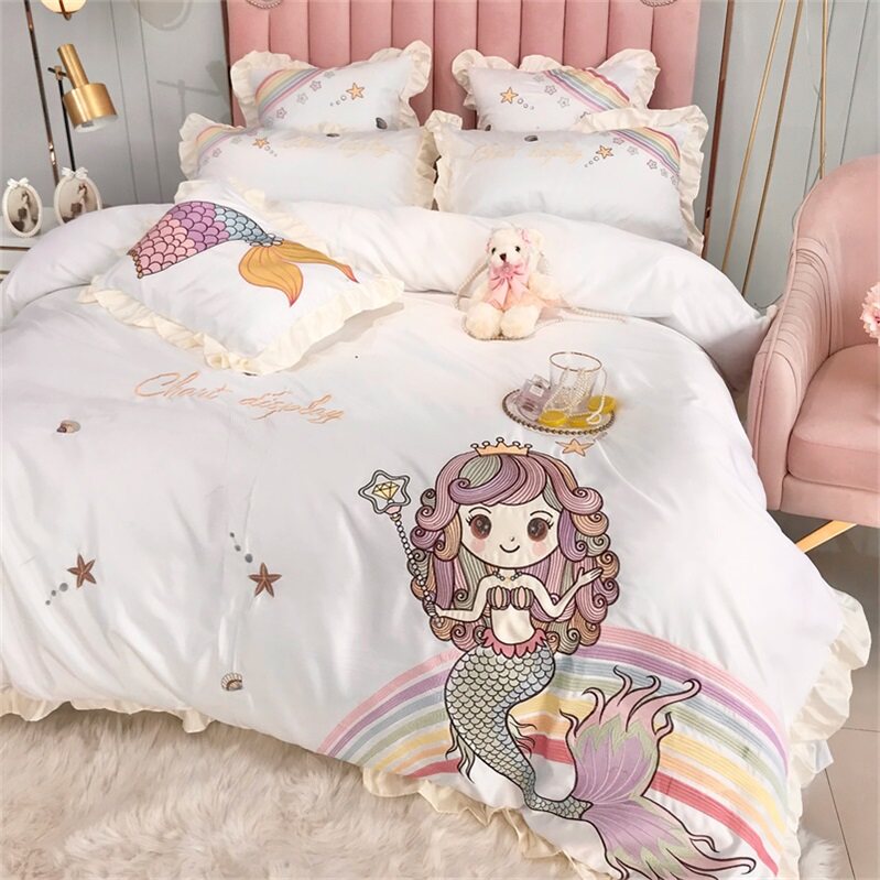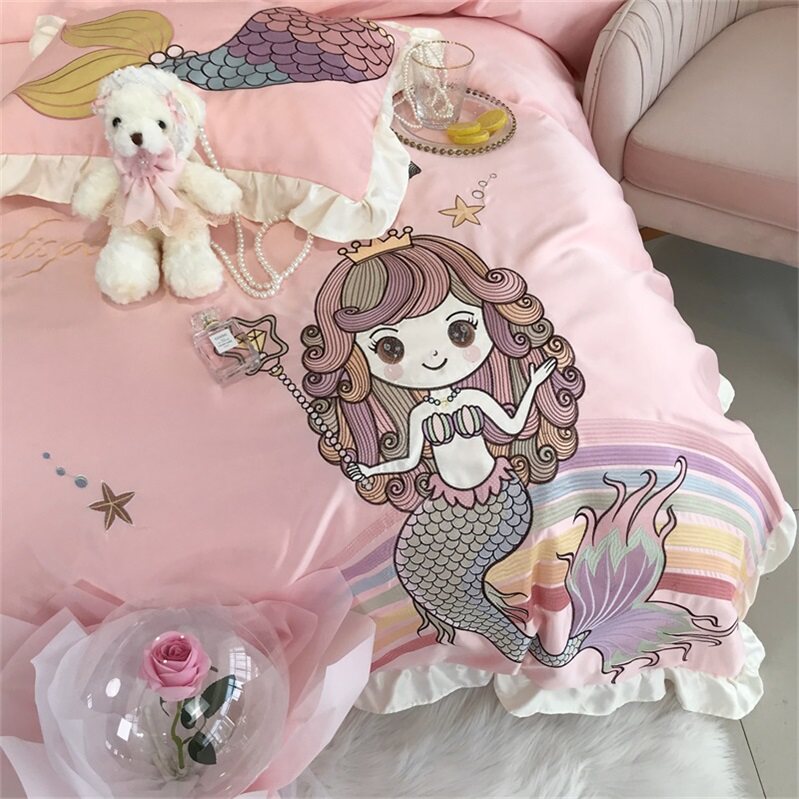 ins net red princess style mermaid embroidery pink four-piece set cotton pure cotton cartoon quilt cover bedding 4