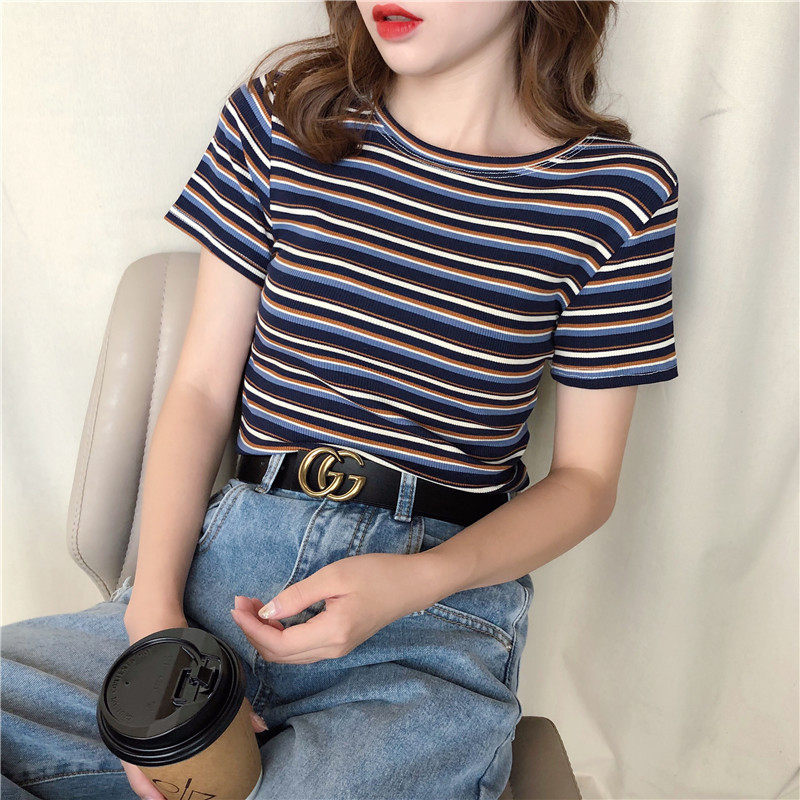 Han Feng Short Sleeve Strip T Shirt Women 2020 Super Web Web Wears in Super Tide Girls Sense European Cargo Summer