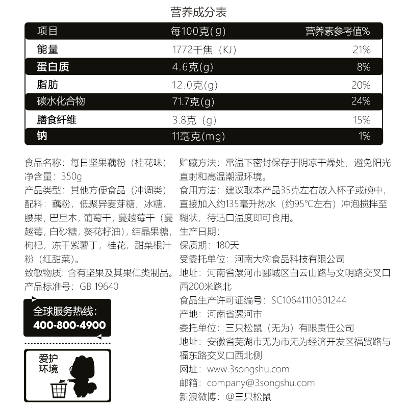 Three squirrels laurel nut powder 350g) Lotus nutrition health substitute breakfast canned