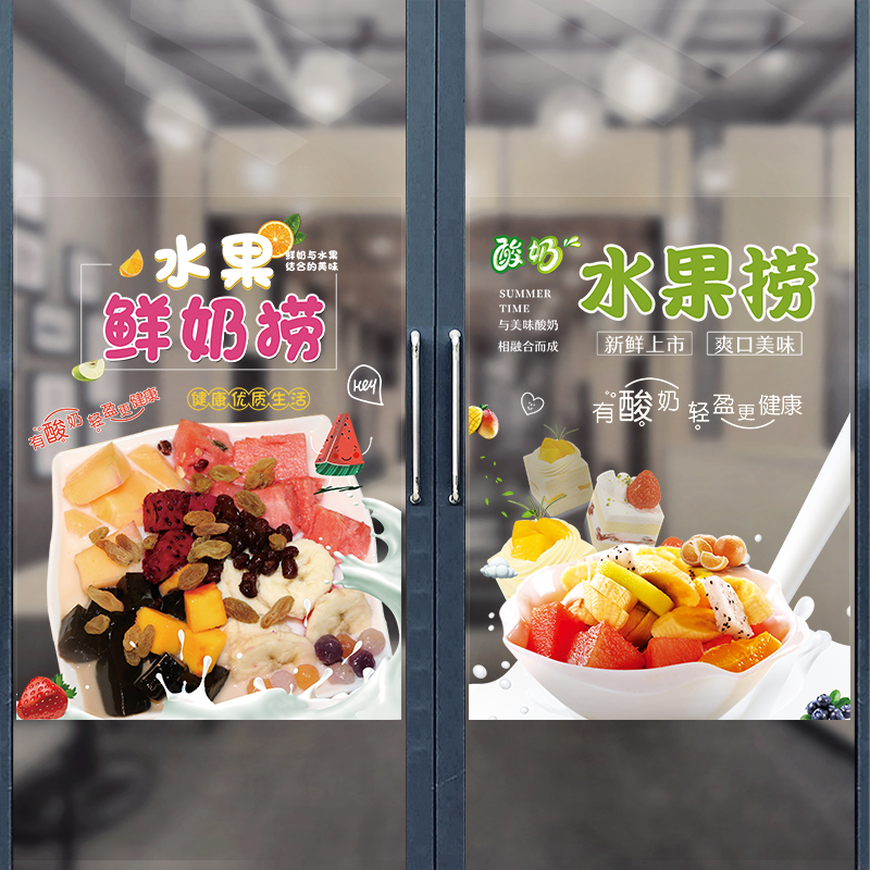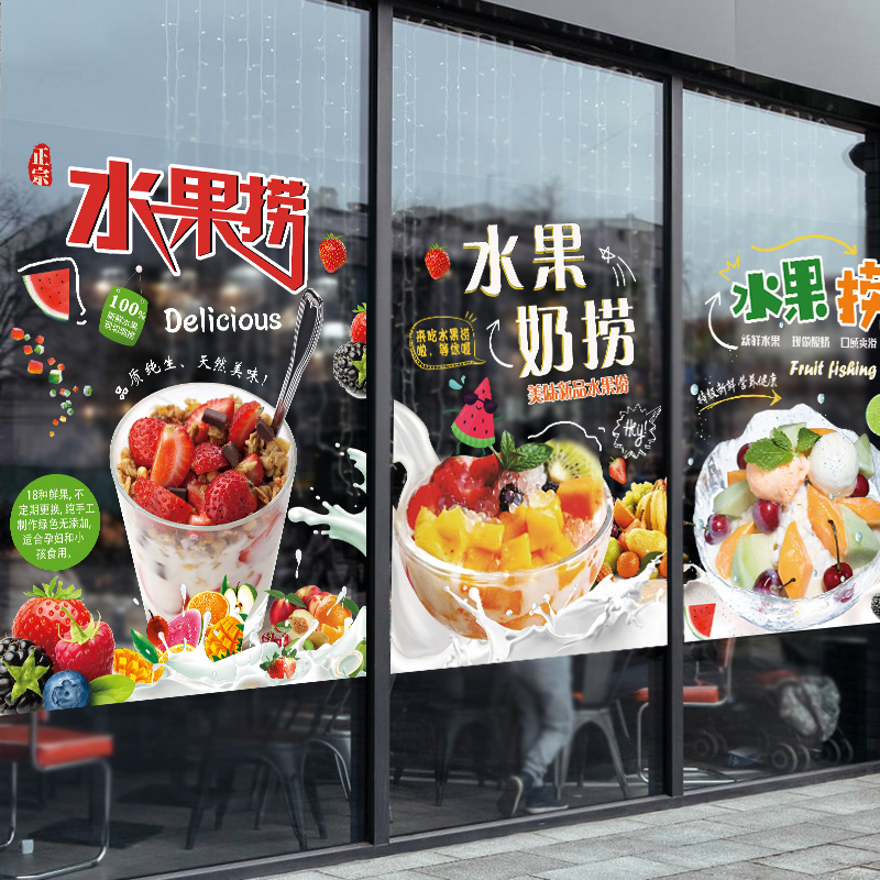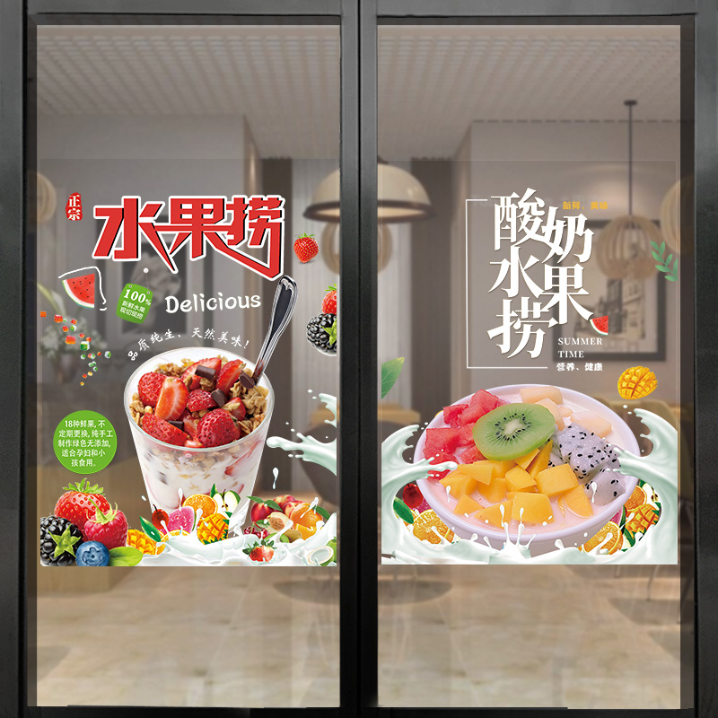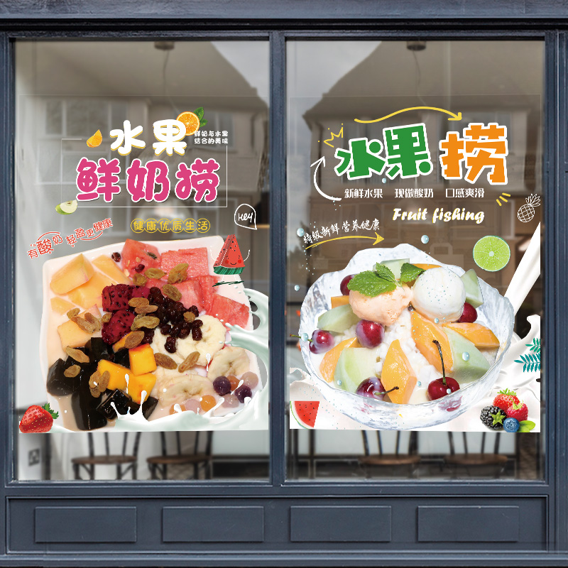 Fruit fishing glass stickers yoghurt with sweet milk tea cold Drinking shop wall Decorative Fried Yogurt Fruit Shop Window Sticker