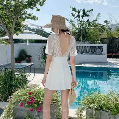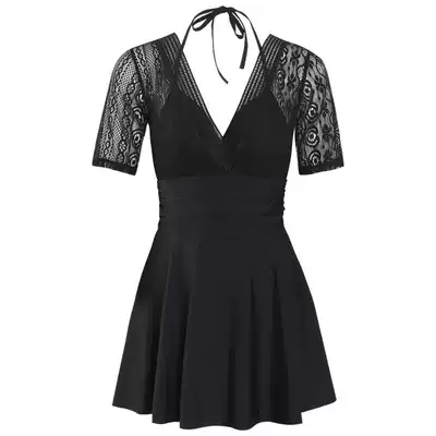 One-piece swimsuit women sexy deep V skirt style steel support gathered Conservative large size belly thin lace hot spring swimsuit