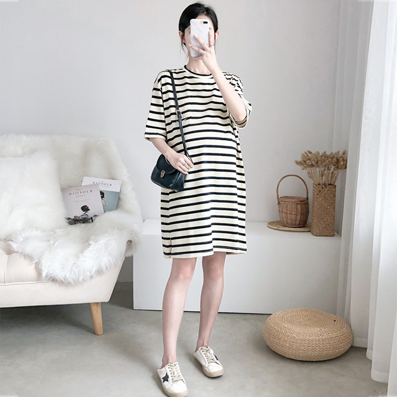 Pregnant woman Summer clothes Han version 2022 medium long version Tide Mother Out Loose Pure Cotton Summer Skirt Striped T-shirt Foreign Dress