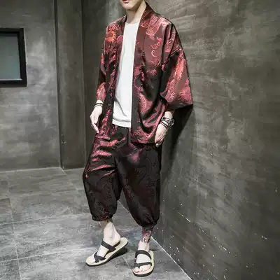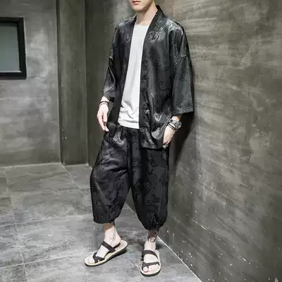 Summer suit men Chinese style road robe men's ice silk kimono loose large size tea clothing ancient style Hanfu embroidery two-piece set