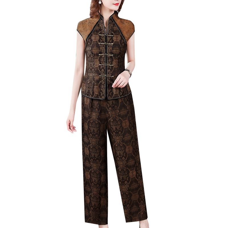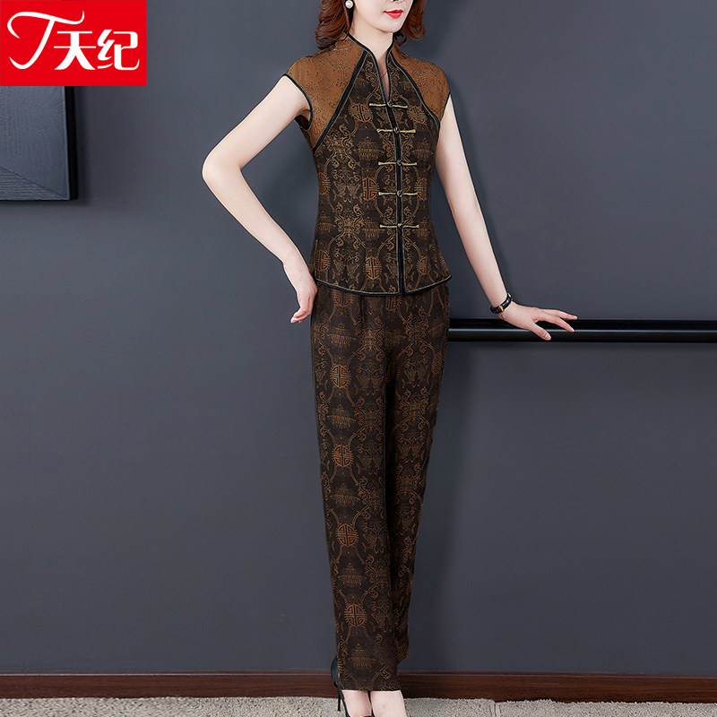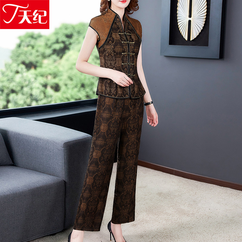 Silk fragrant cloud yarn suit female 2022 new summer mother age reduction fashion Tang suit two-piece wide-leg pants Western style