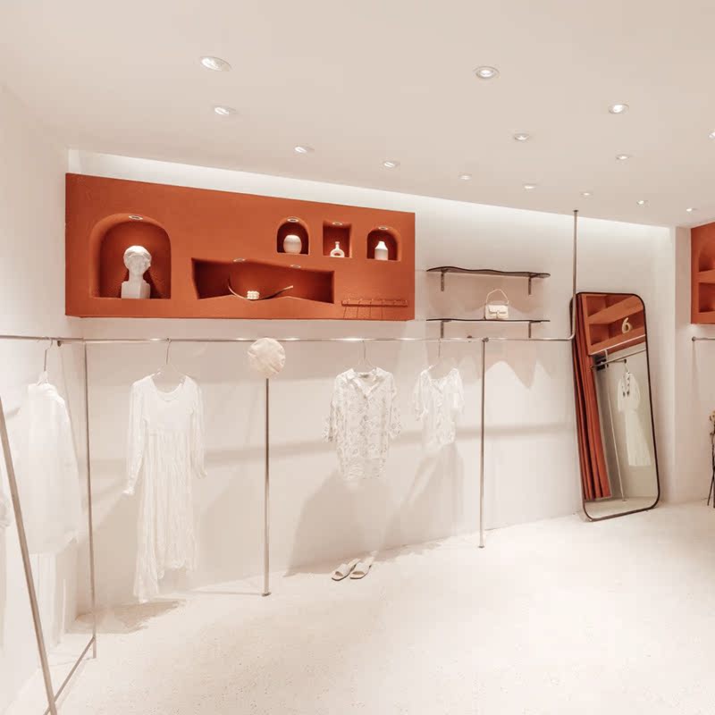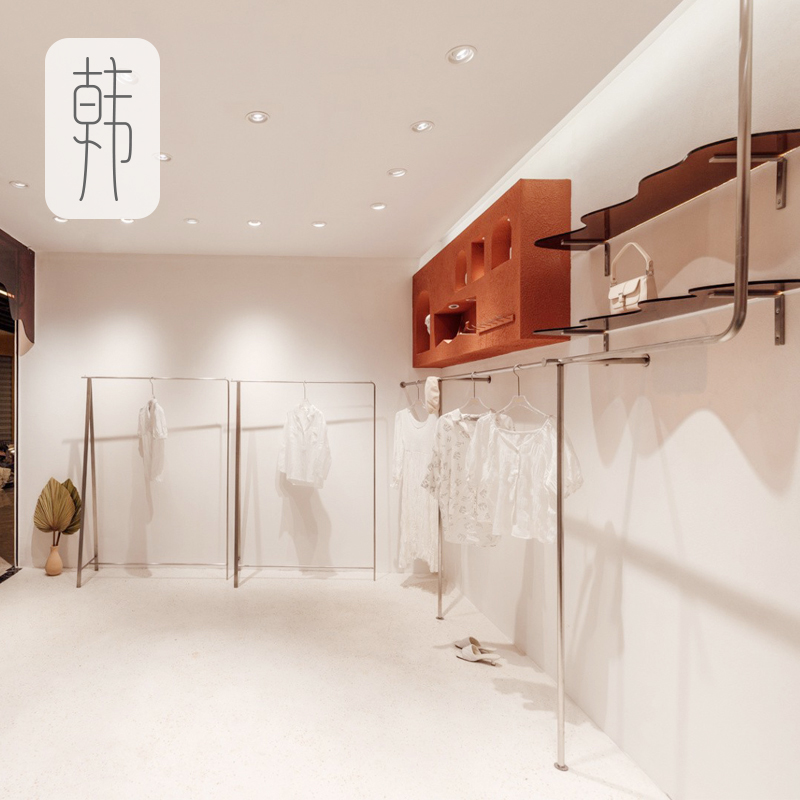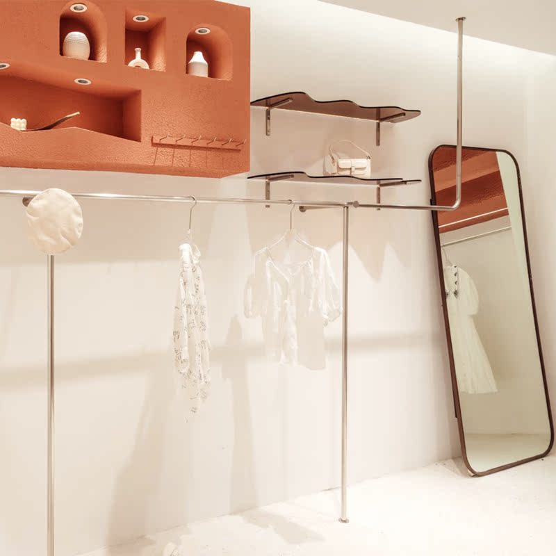 Clothing store shows the shelf girls mounted on wall hanging hanging stainless steel shelves on the front side display shelves