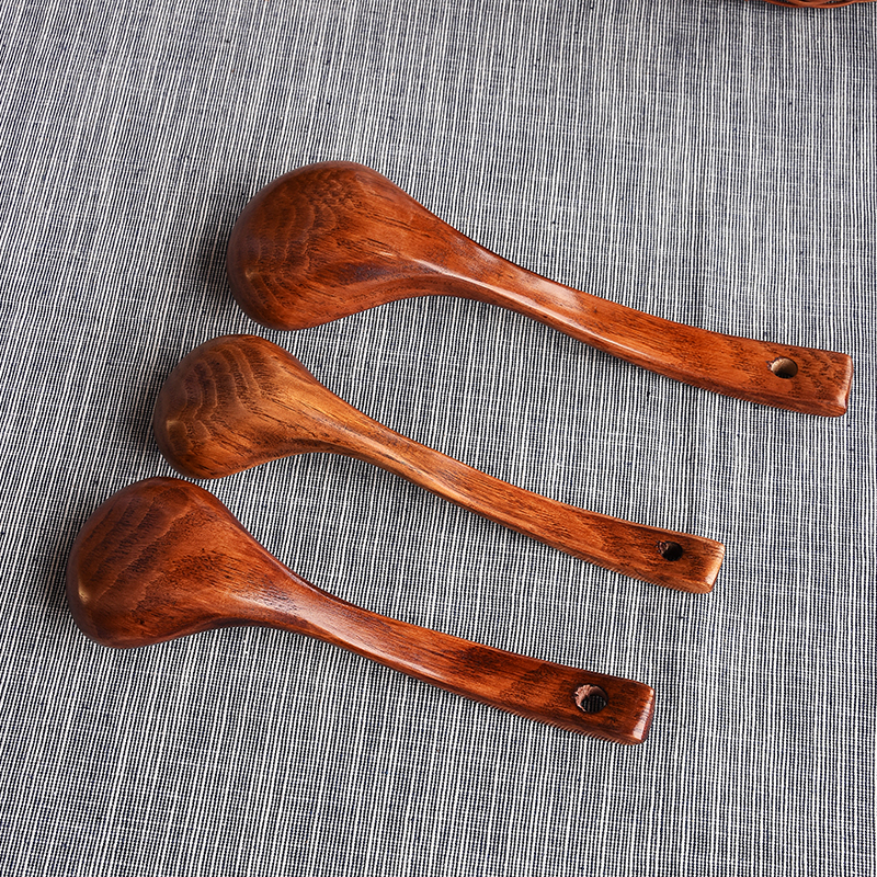 Silver-coloured large wooden soup spoon in the middle of a wooden soup spoon.