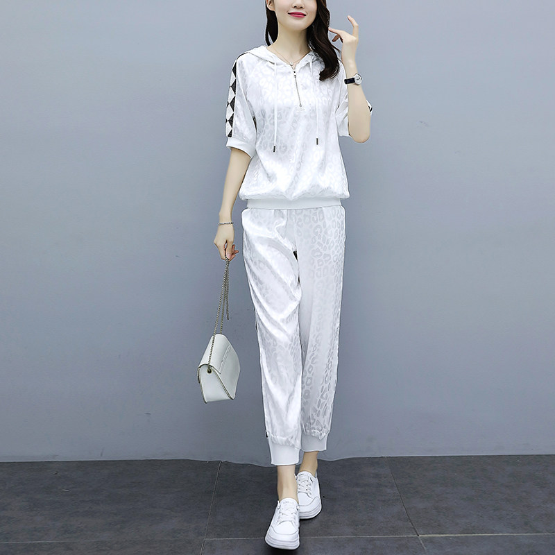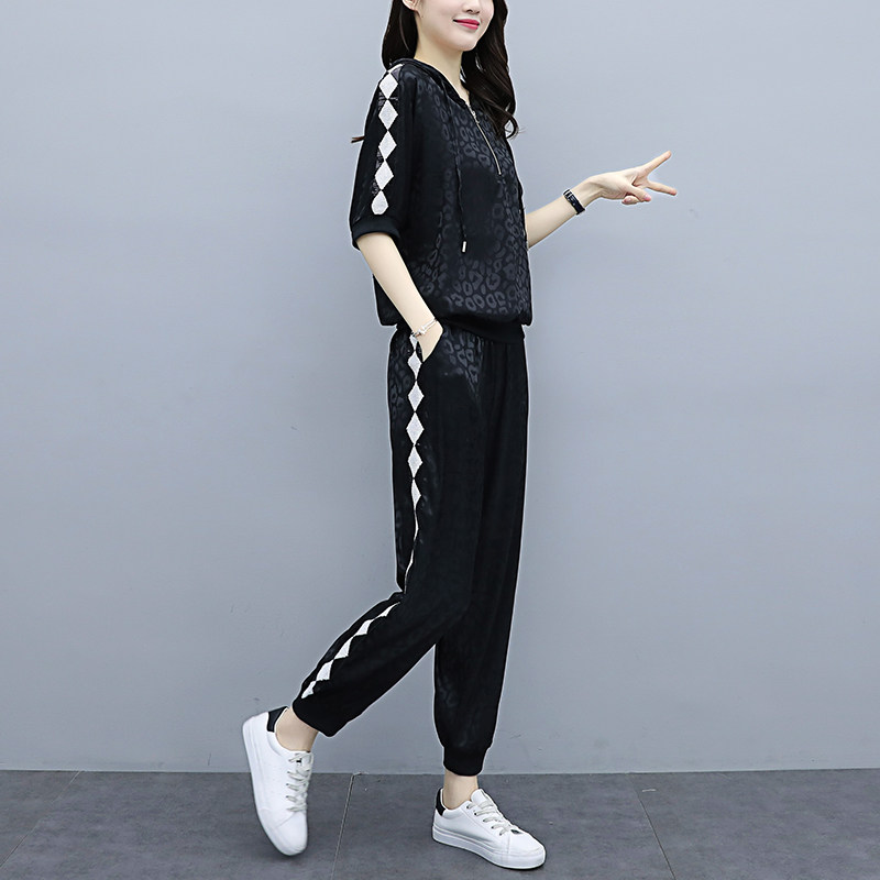 2023 summer new fashion sports suit large - code women's loose short - sleeved coat leisure slim pants two pieces