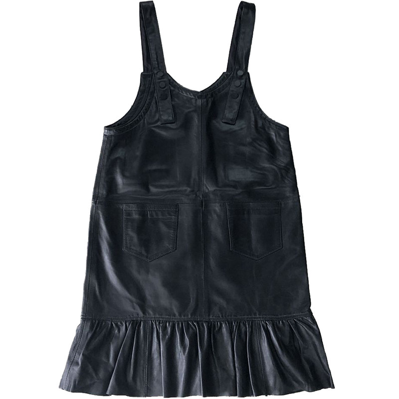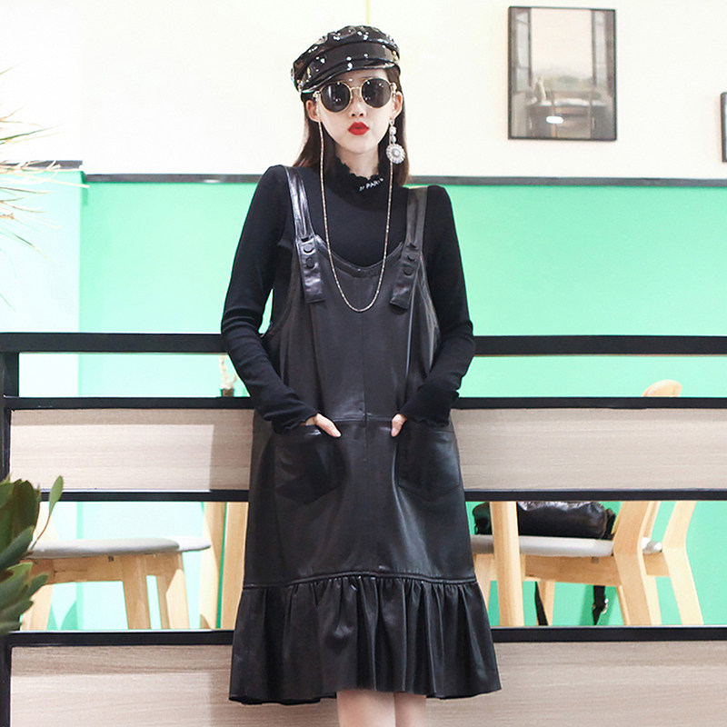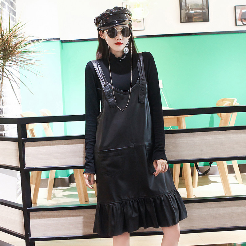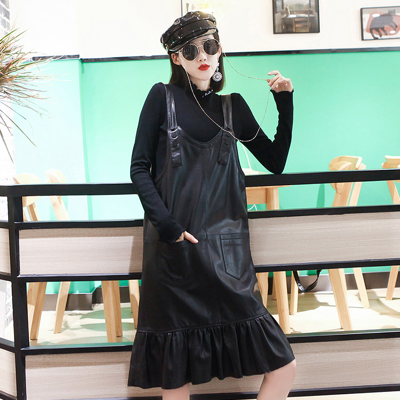 Genuine Leather Dress Woman Sheep Leather Temperamental Lotus Leaf Side Holding Baby Bag Skirt Autumn Winter New slim fit long dress Chaos