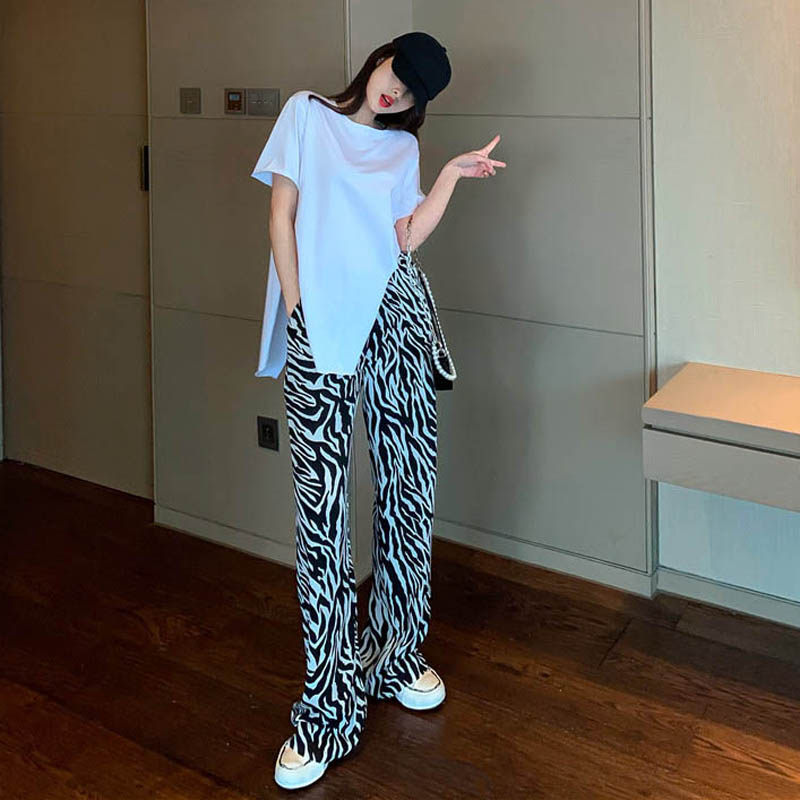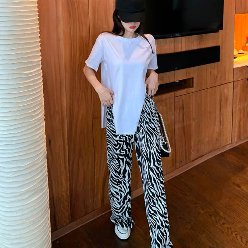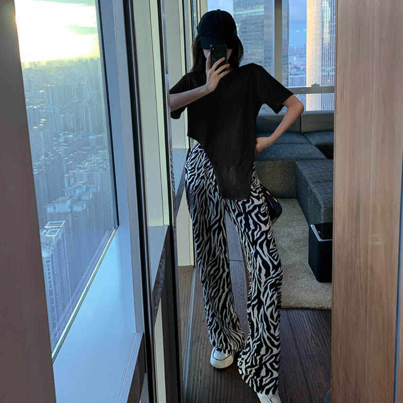 2021 new Hong Kong style retro Korean chic irregular T-shirt zebra pattern wide-leg trousers two-piece suit women