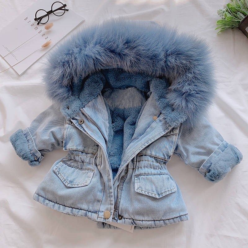 Girls Denim Jacket Loose fashion trend plus velvet Girls 2019 winter quilted jacket Baby thickened raccoon hair collar