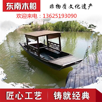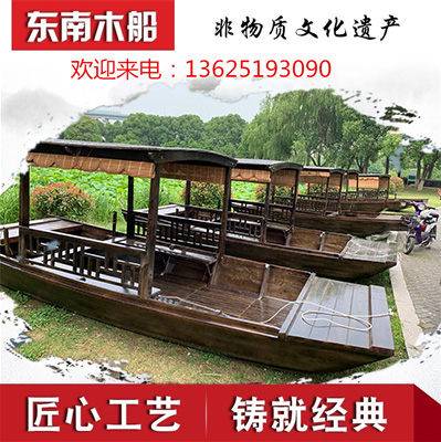 Wooden boat Solid wood water sightseeing tour boat Hand rowing single canopy boat U tent boat Outdoor pure electric antique wooden boat