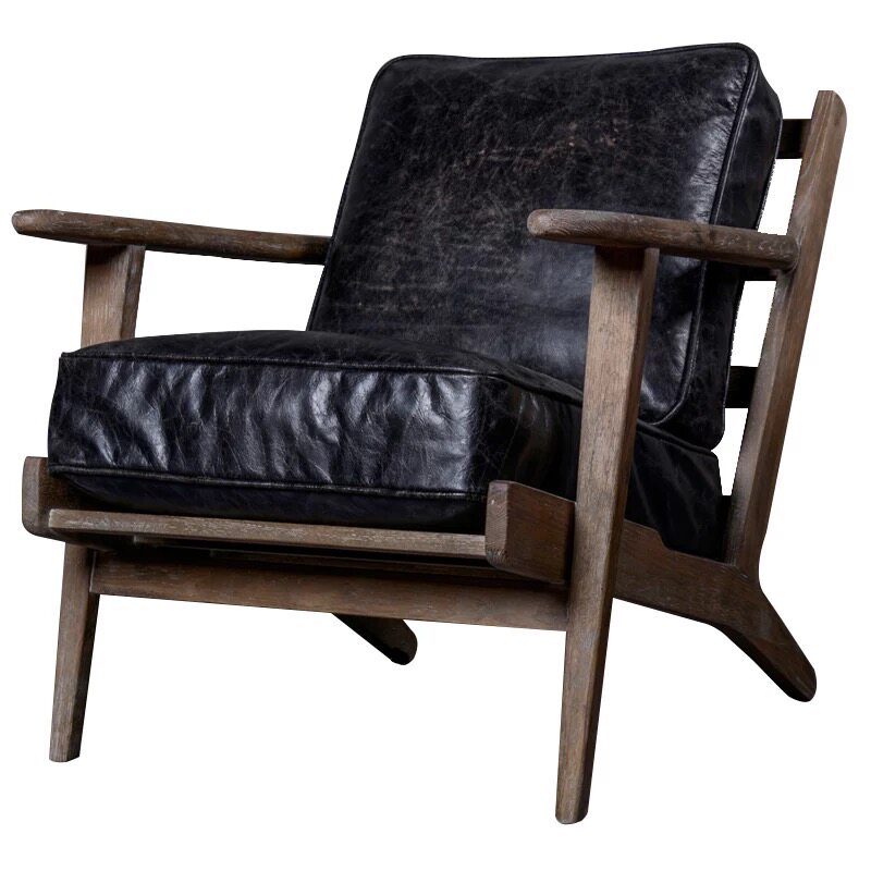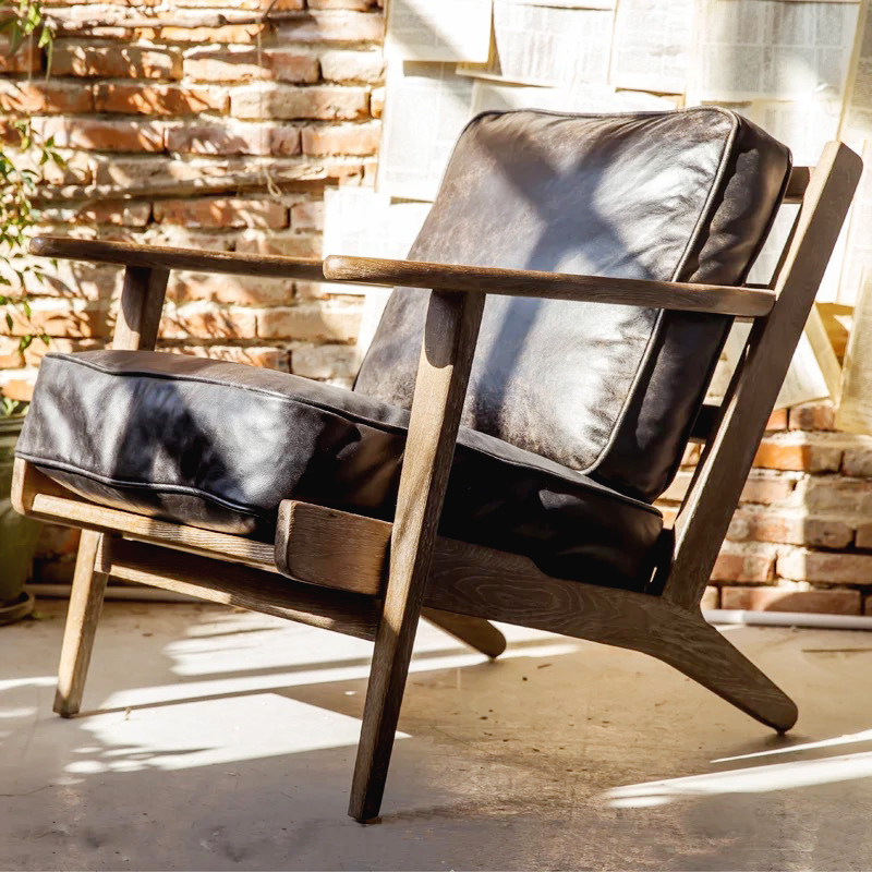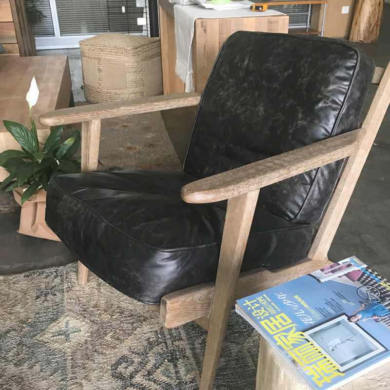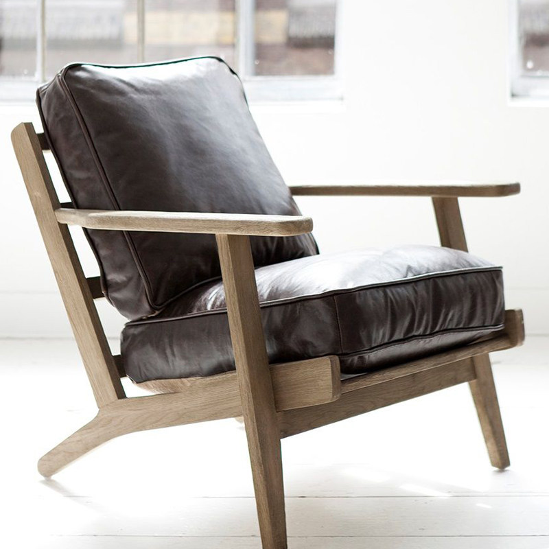 Nordic Oak Sofa Chair Solid Wood Retro American Leather Leisure Tiger Chair Bedroom Balcony Single Armchair