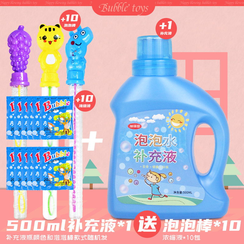 One bottle of 500ml, two bottles of bubble sticks, 500ml, three bottles of bubble sticks, 500ml, three bottles of bubble sticks, 30 packs of concentrated liquid, one bottle of 500ml, 10 bubble sticks, 10 packs of concentrated liquid