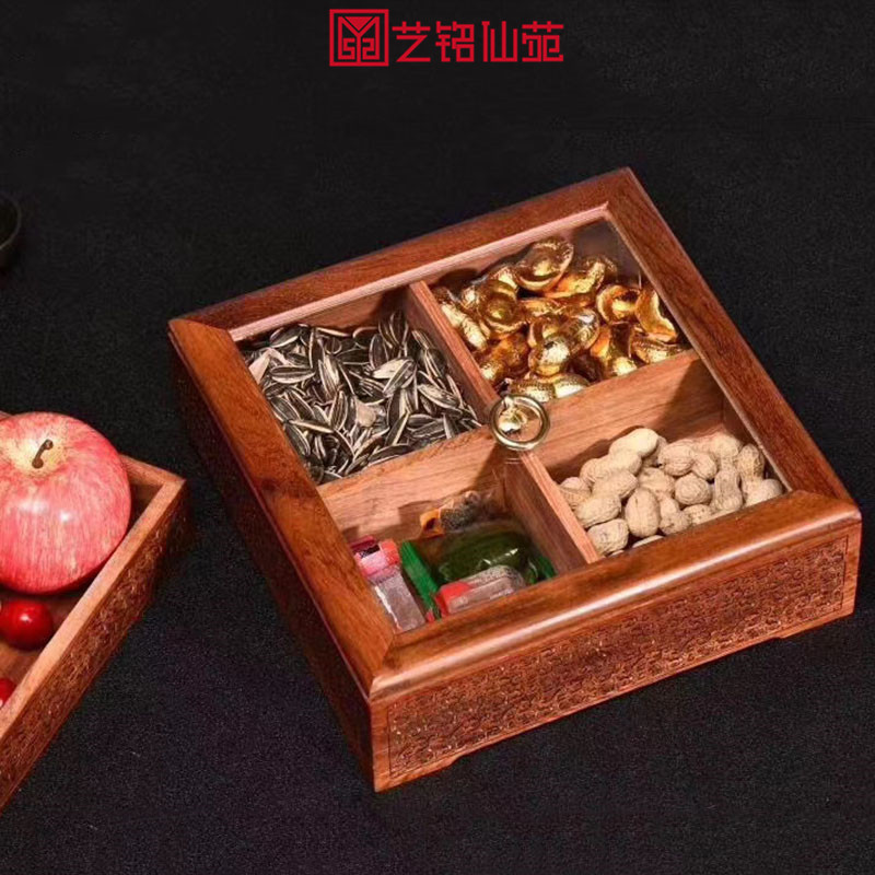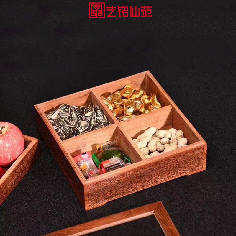 YiMing Xianyuan Myanmar Pear Single Board Carved Four-Quarter Grid Fruit Plate Snack Platter Home Living Room Storage Box