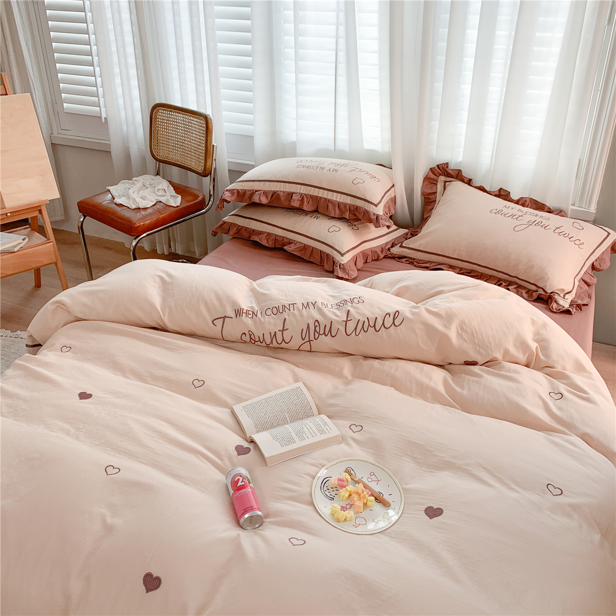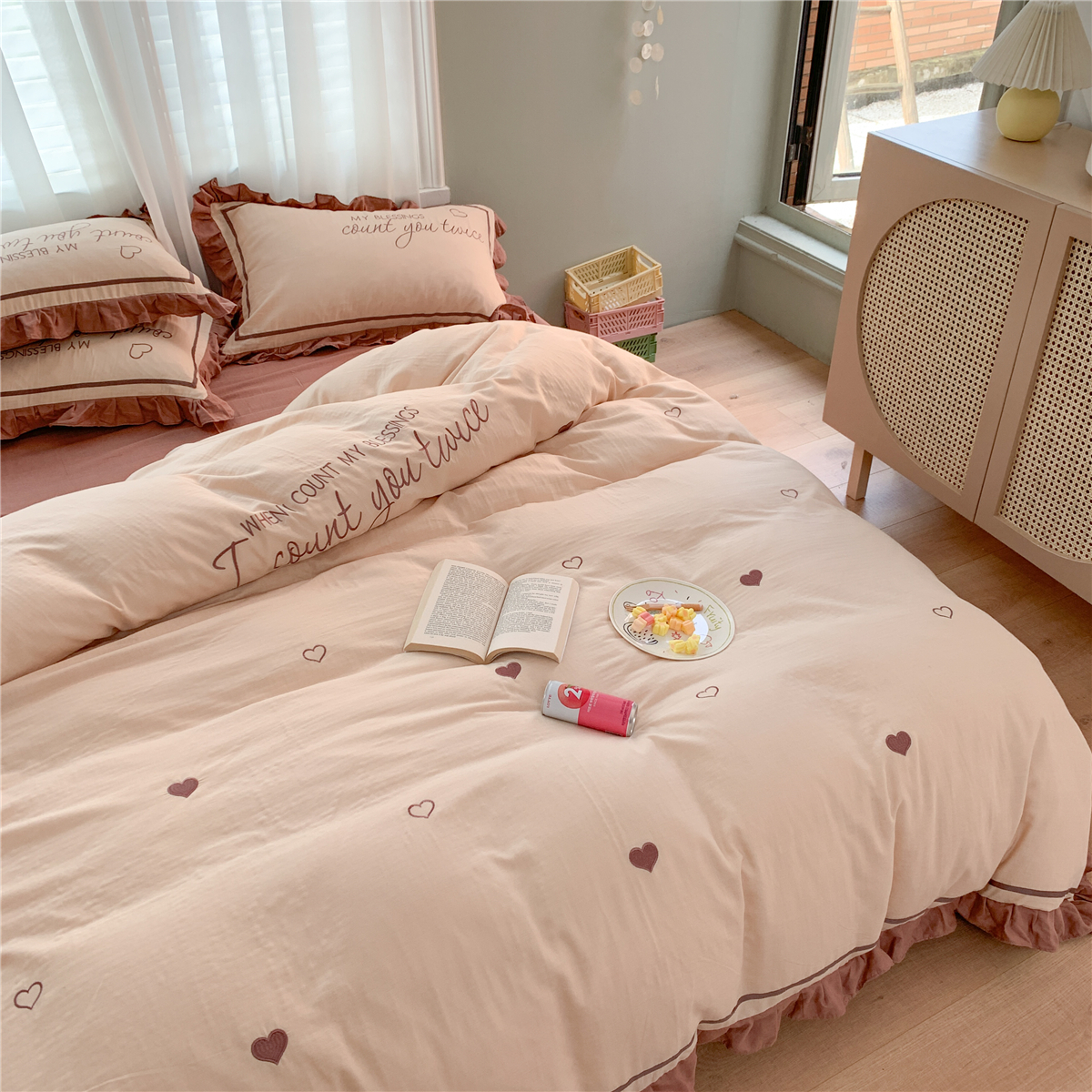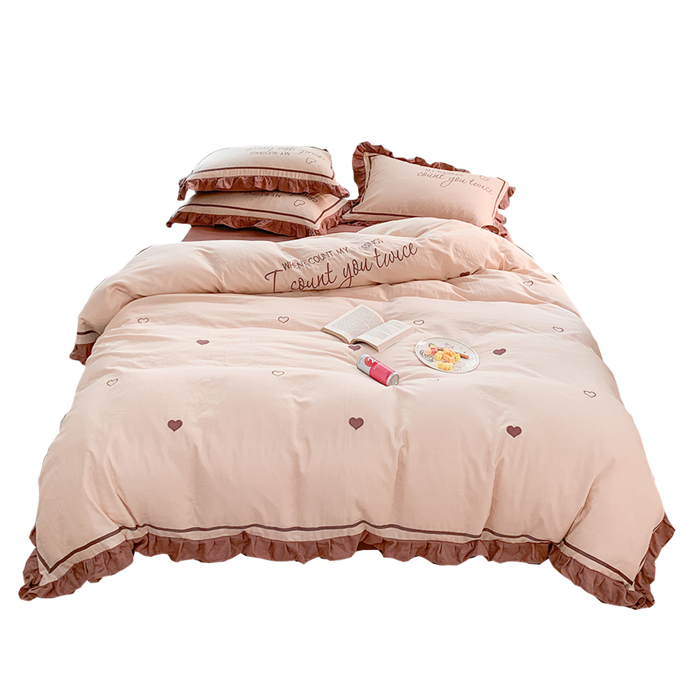Pastoral beauty Soft and comfortable double-layer yarn cotton four-piece embroidery love ruffles Korean style bedding