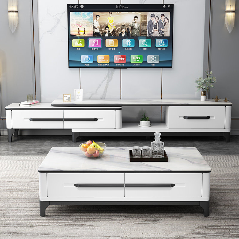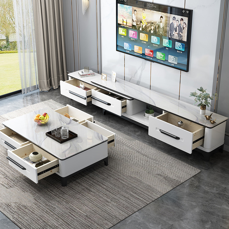 Modern simple marble solid wood TV cabinet coffee table combination small apartment home living room retractable TV wall cabinet