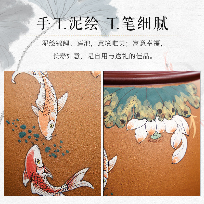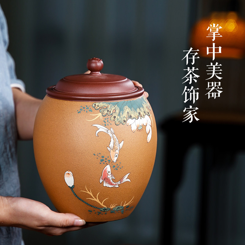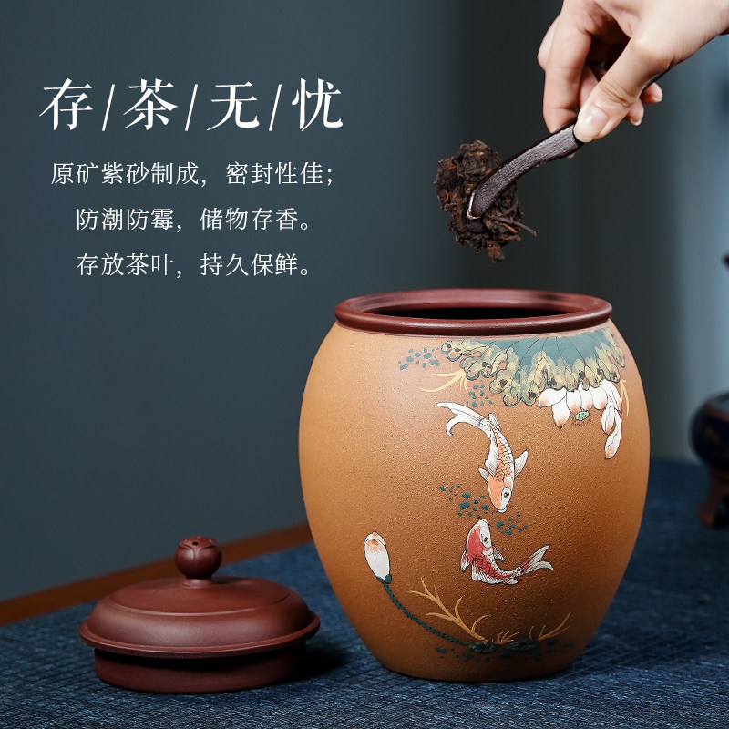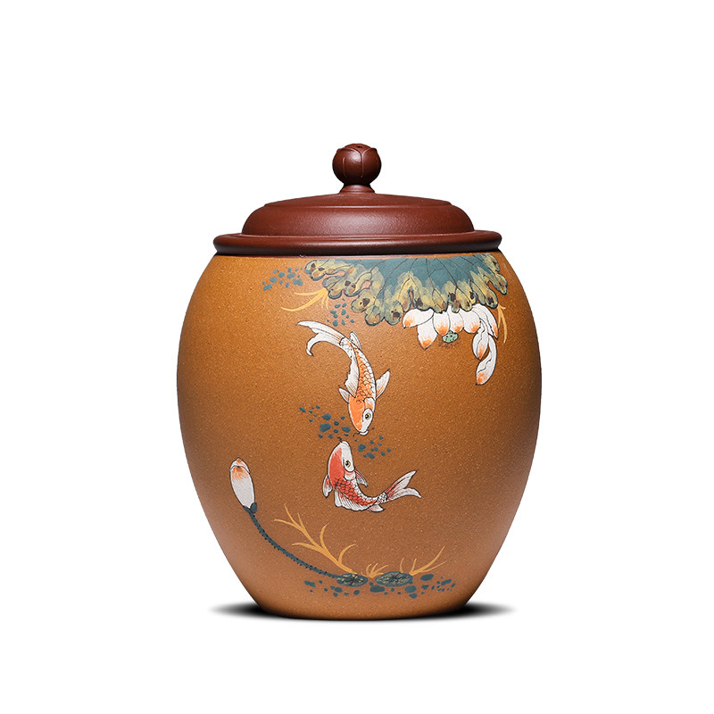 Fish play between lotus leaves Yixing Purple sand tea pot Puer loose tea pot Household storage tea pot Mud painted Koi carp about a pound