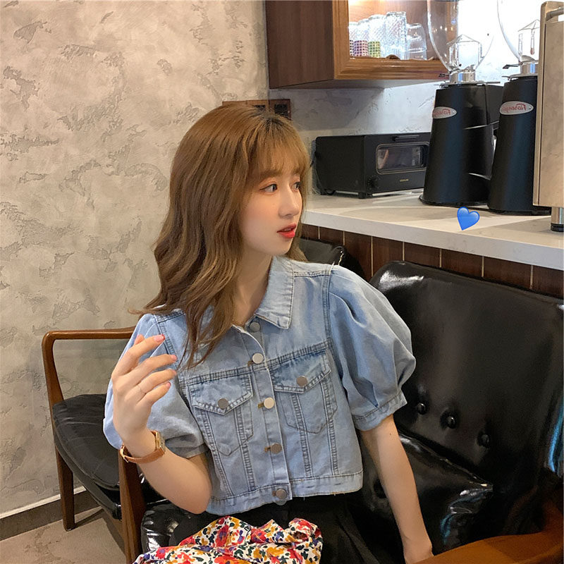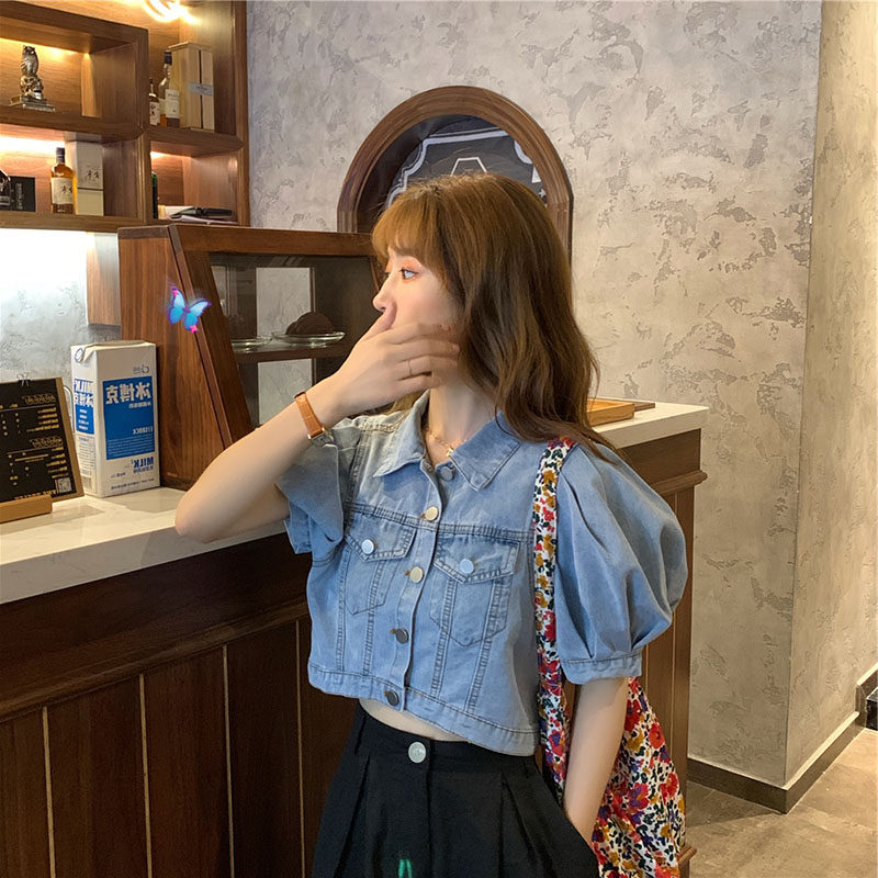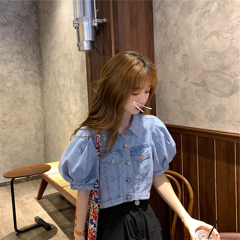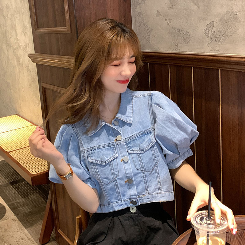 French puff sleeves short European and American ins Korean style chic tops denim shirts women's design sense niche summer short sleeves