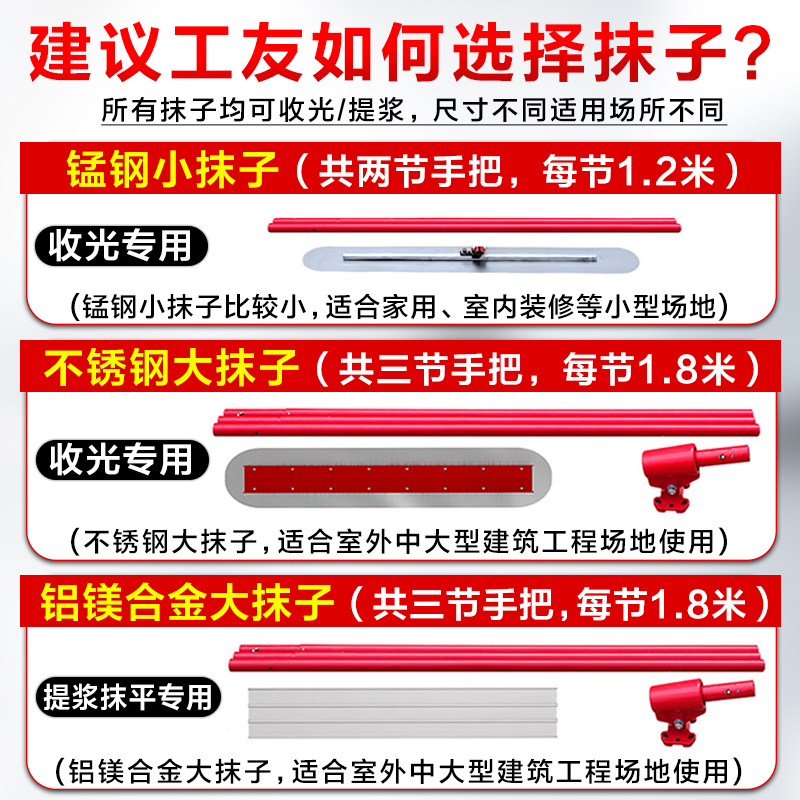 92 * 12 5cm manganese steel closeout small trowel (not recommended) 90 * 20cm stainless steel (finish light) large trowel 120 * 15cm stainless steel (light collecting) large trowel