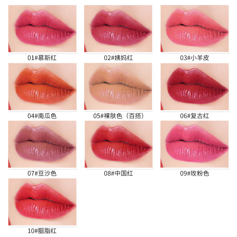 01#慕斯红02#姨妈红(large cherry color) 03#小羊皮(nude color) 04#南瓜色(Western grapefruit) 05#裸肤色06#復古红(blood red) 07#豆