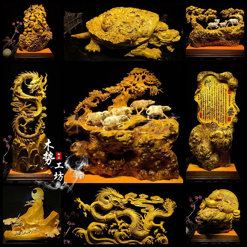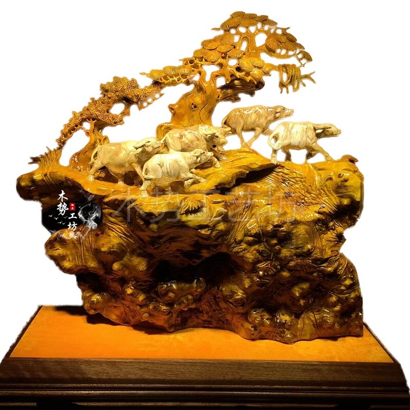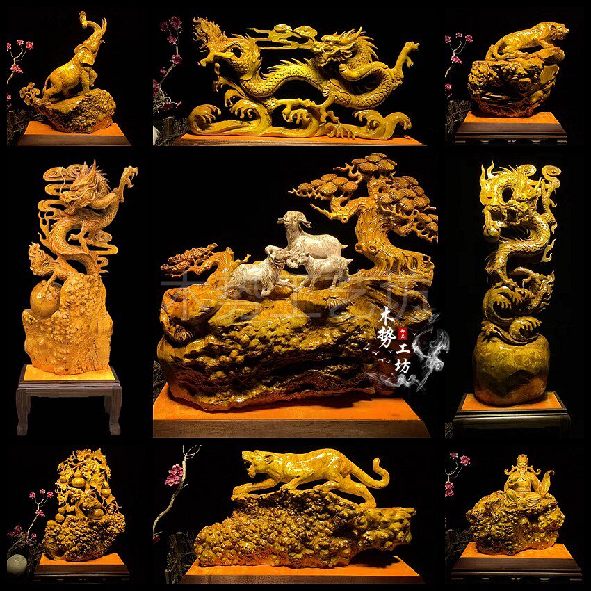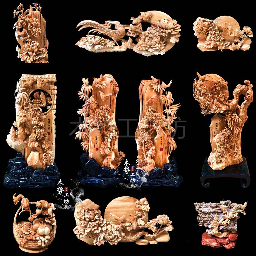 Cliff cypress flowers, birds, lions, tigers, leopards, golden silk, nanmu, landscape root, carving, wood carving, animals, lucky ornaments