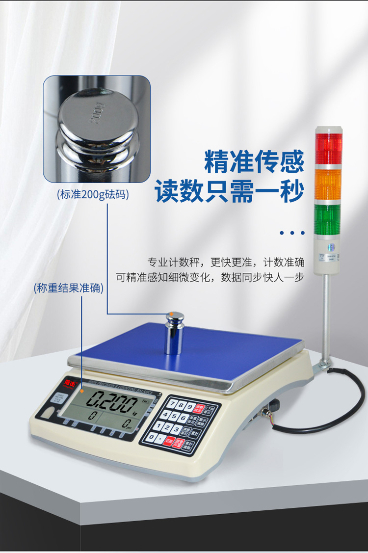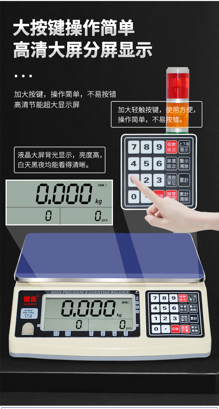 3kg 0 1g with three-color alarm light 1kg 0 01g with three-color alarm light 10kg 0 2g with three-color alarm light 5kg 0 1g with three-color alarm