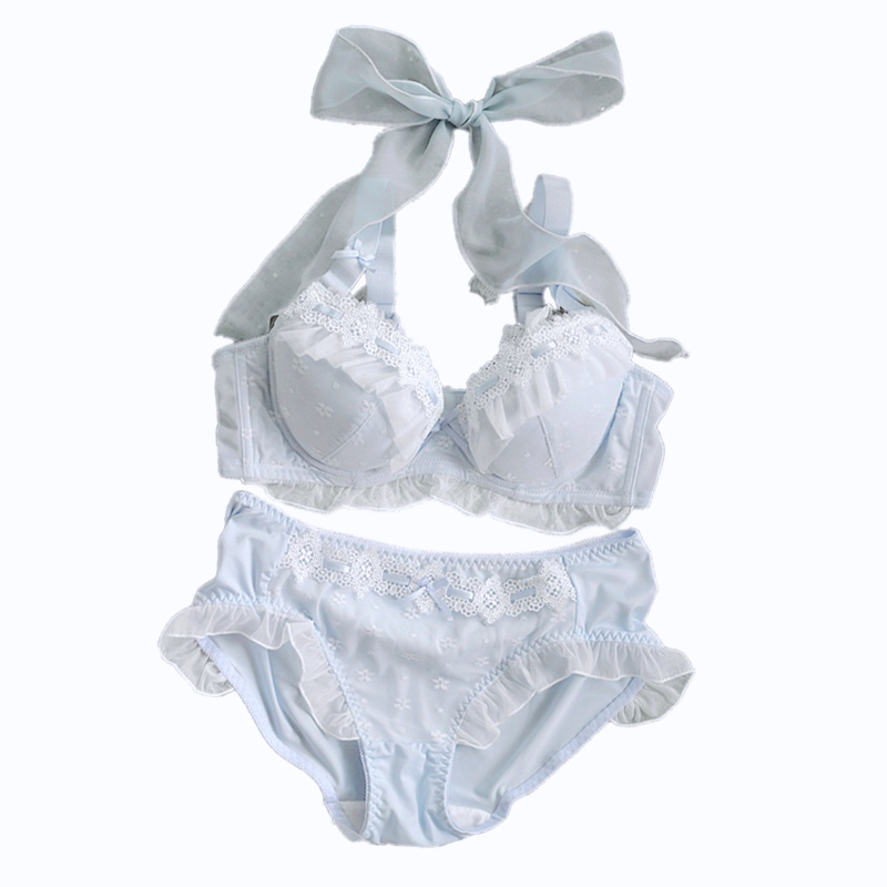 Cute water-soluble lace light blue thin cotton large cup bra set Lolita gathered sexy underwear to support women