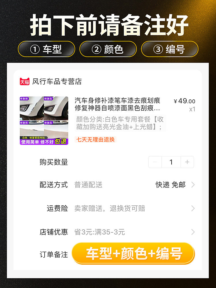 Display Not applicable vehicles can also be shot All model colors Have a message model color Easy paint repair package (Message model year color) White car special package(collection plus purchase