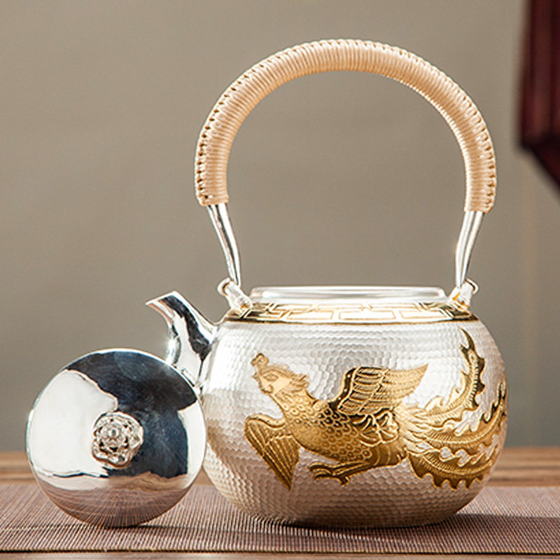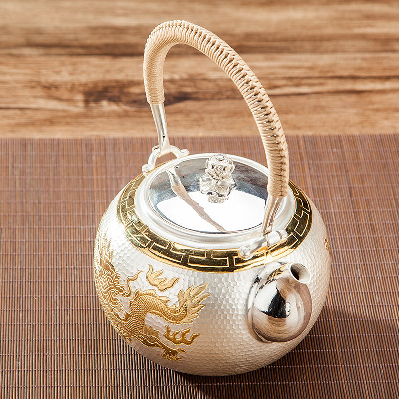 Silver pot, sterling silver 999 kettle, dragon and phoenix gilt tea making household kettle, pure handmade silver pot - Taobao