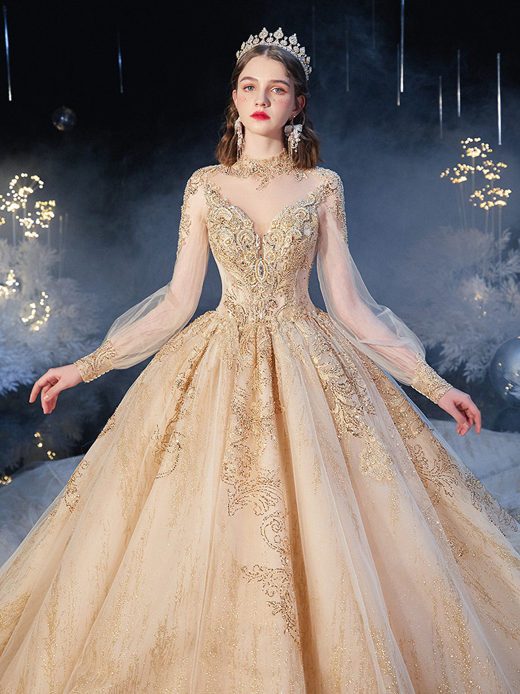 French high - collar at escape princess gold wedding dress rental 2022 new Suzhou bride long sleeve drag the master yarn