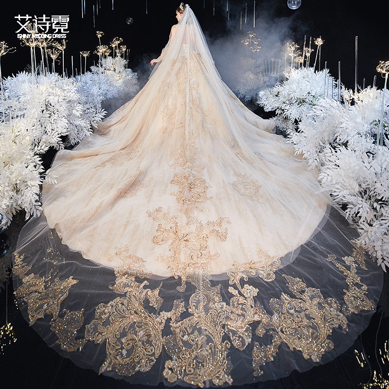 High luxury gold high-tie wedding dress lease master yarn drag-tail deposit heavy-working luxury high-collar wedding dress rental purchase Suzhou high-staple gold headmaster yarn stained gold high-ranking chief of the lease