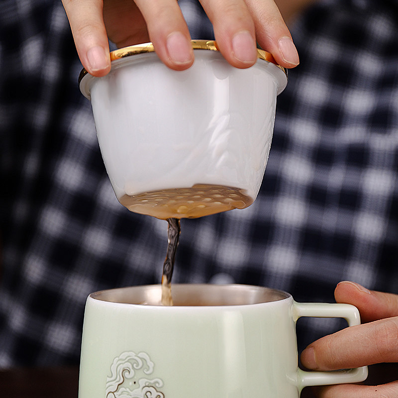 Longquan celadon sterling silver tea cup with lid filtered tea water separation bubble cup with tea can office gift customization