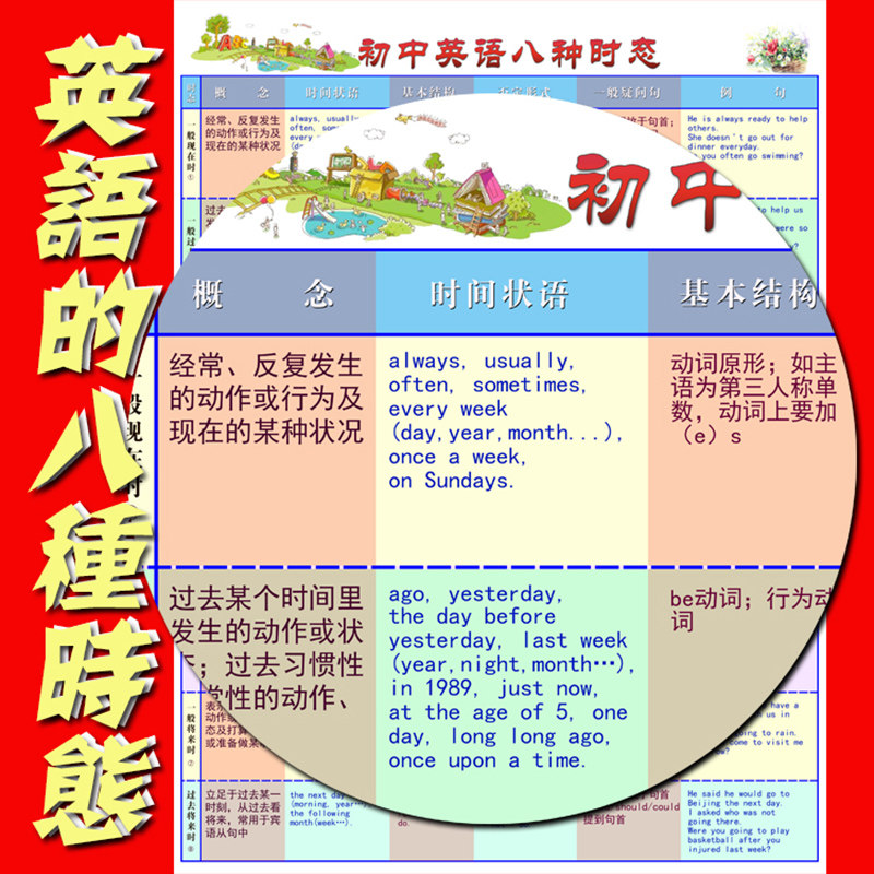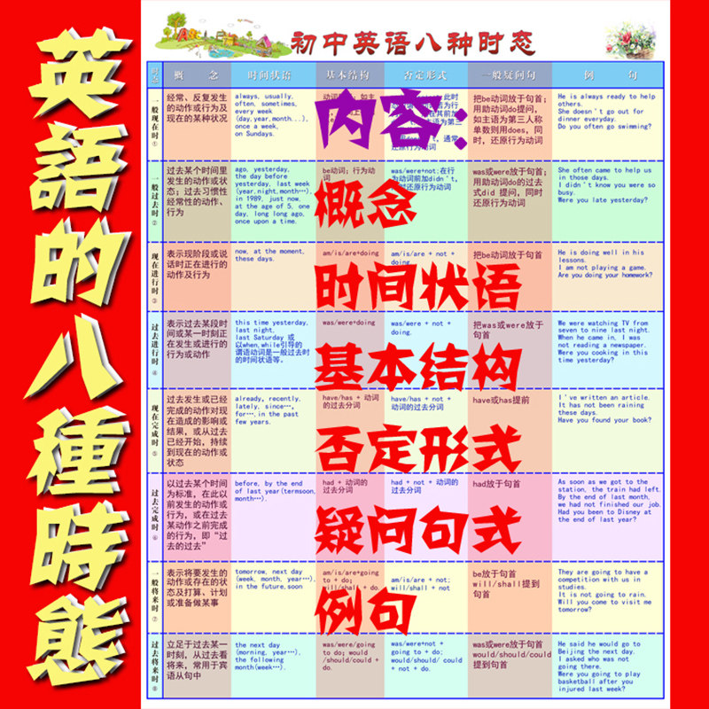 English 8 tenses wall chart grammar knowledge point wall chart elementary and junior high school English review test teacher recommendation