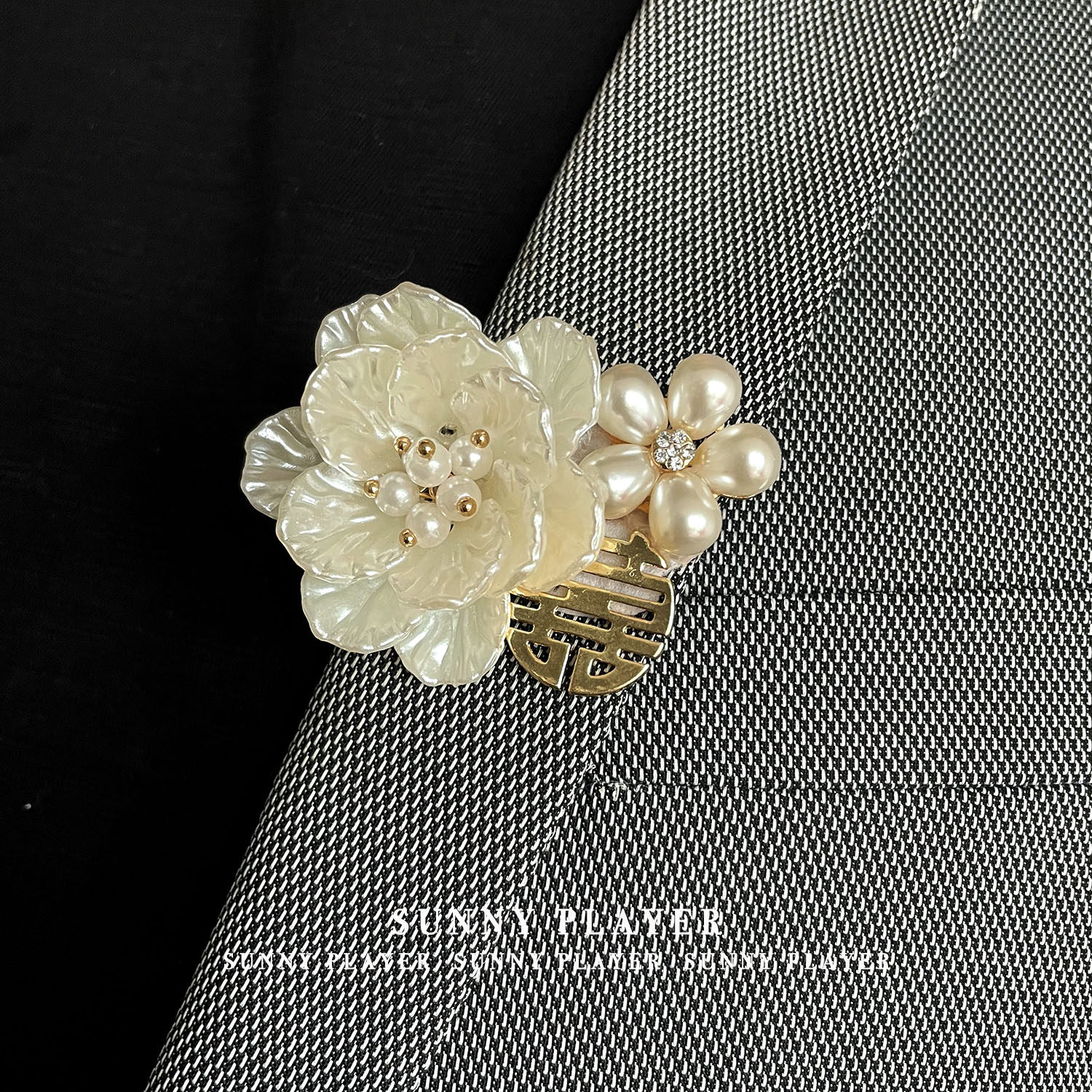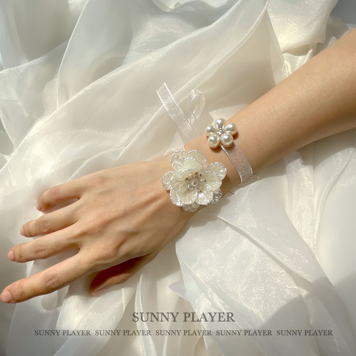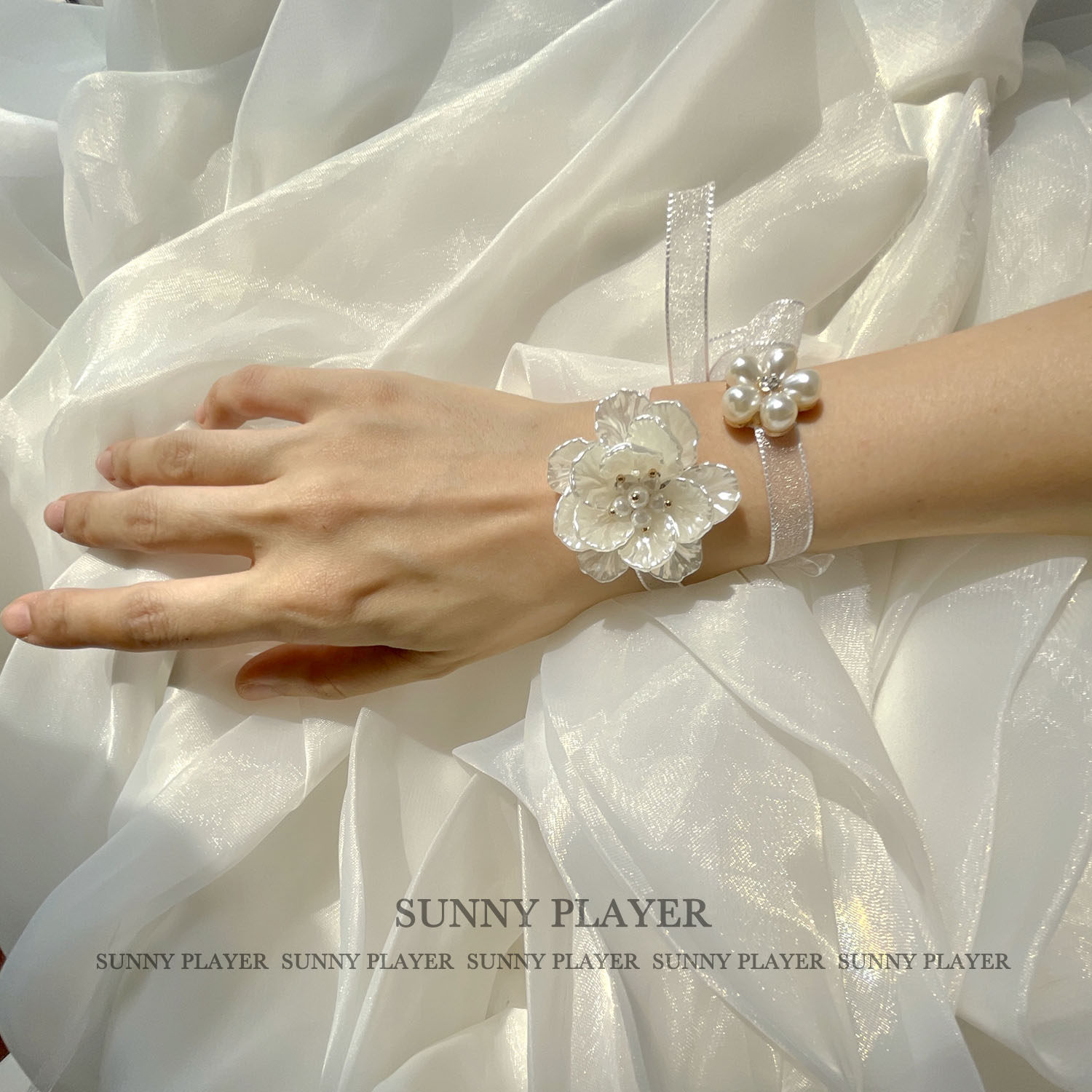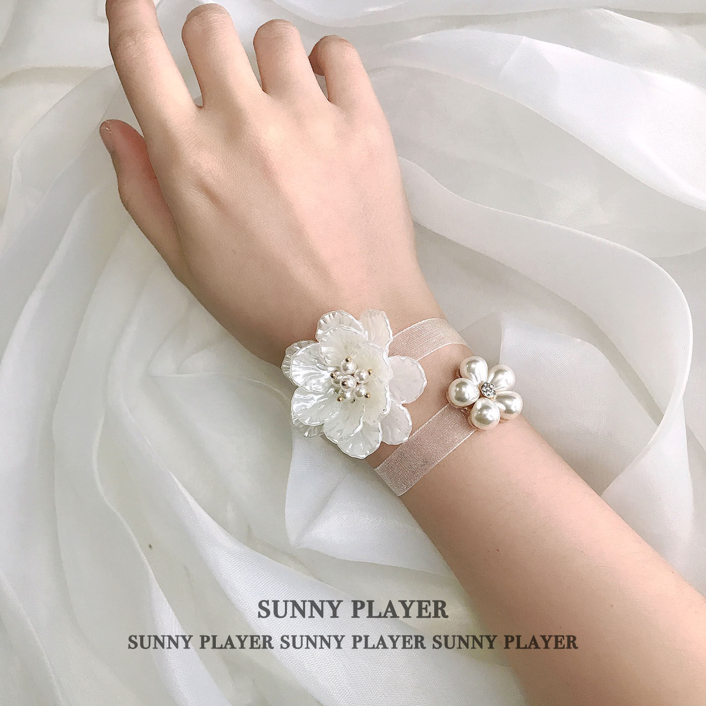 Bridesmaid wrist flower wedding bride sister group Korean small fresh ins style pearl white super fairy ribbon hand flower